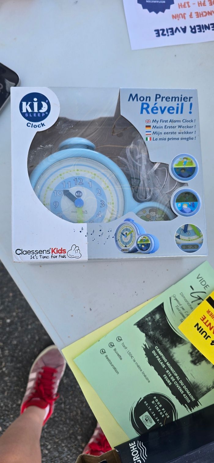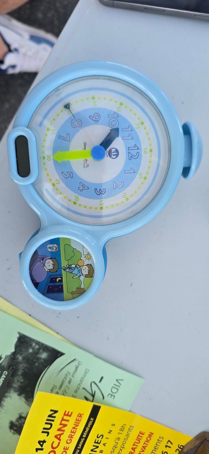 Réveil éducatif, marque Kid sleep Plusieurs fonctionnalités, avec ou sans alarmes, avec ou sans "garçon endormi/réveillé", rétro-éclairage de l'horloge en appuyant sur le buzzer. Lecture de l'heure avec les aiguilles et en analogique. Fonctionne sur secteur (fourni) ou à pile En excellent état Fonctionne parfaitement