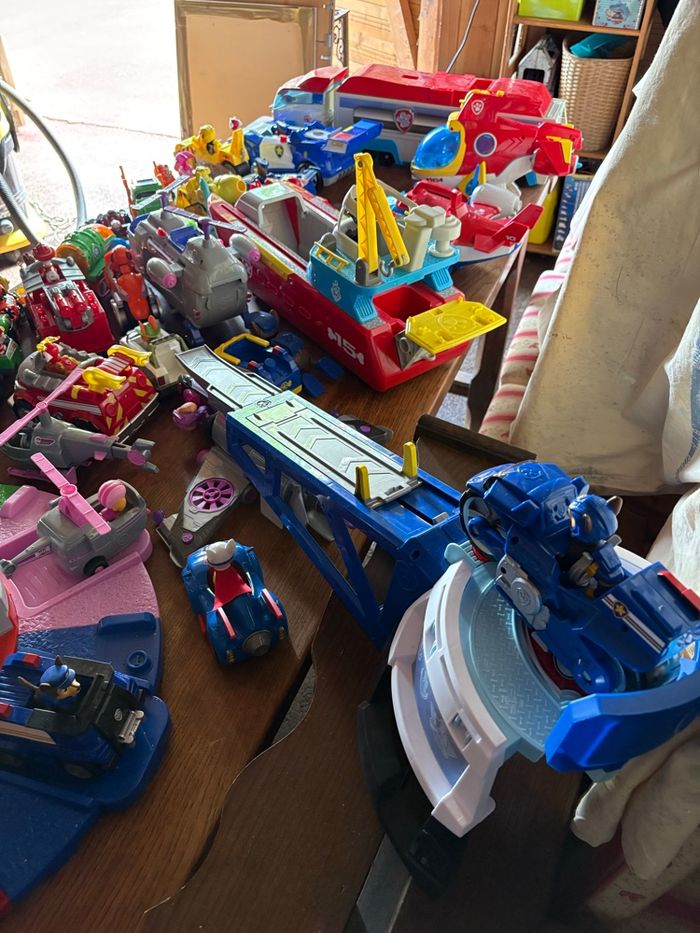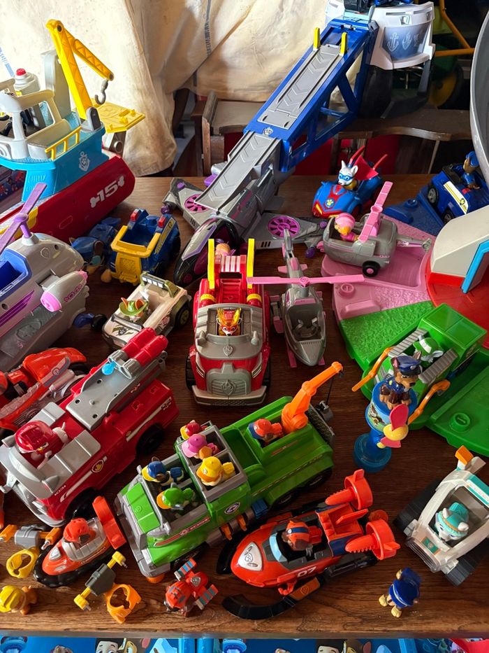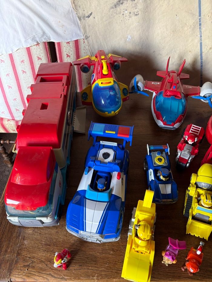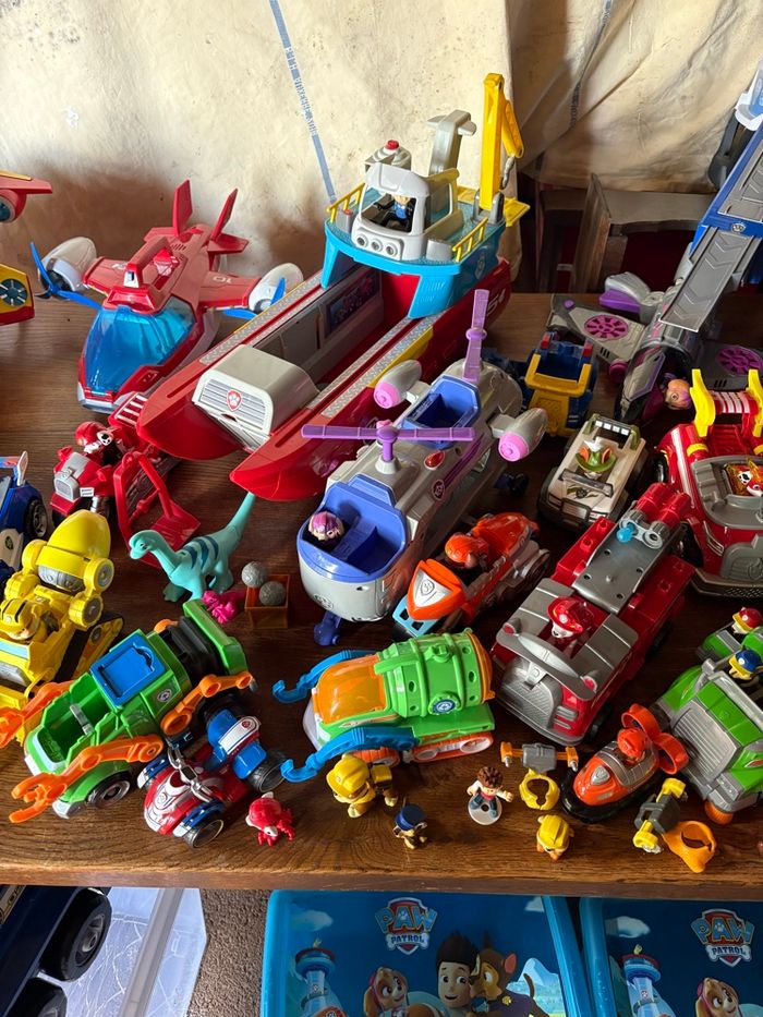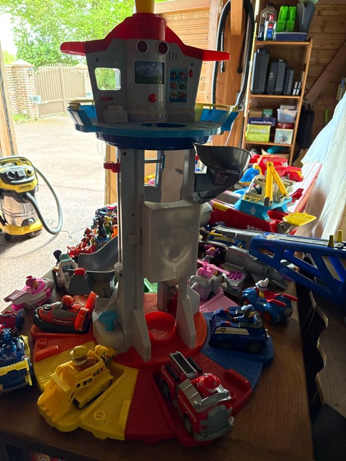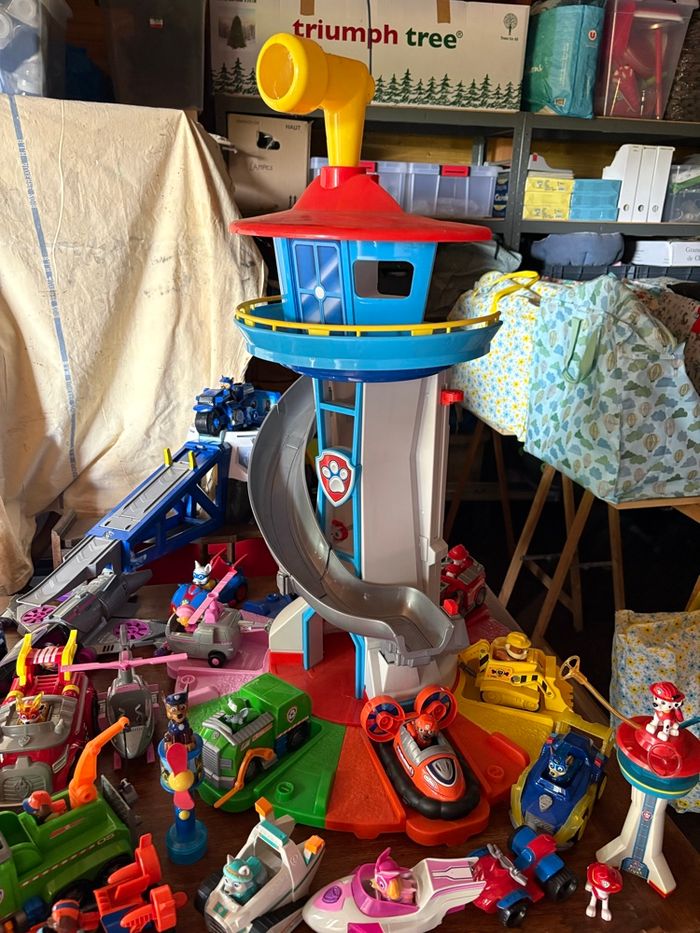 Super Lot de Jouets Pat Patrouille Notamment : Le Quartier Général - Tour de Contrôle Le super camion de Chase Le super hélicoptère de Stella Le Pat Patrouilleur Le sous marin L’avion L’avion de Stella Super Patrouille Base Moto et moto Chase Ruben Marcus Zuma Le pat patrouilleur des mers Divers personnages et accessoires Boîtes vendues avec.