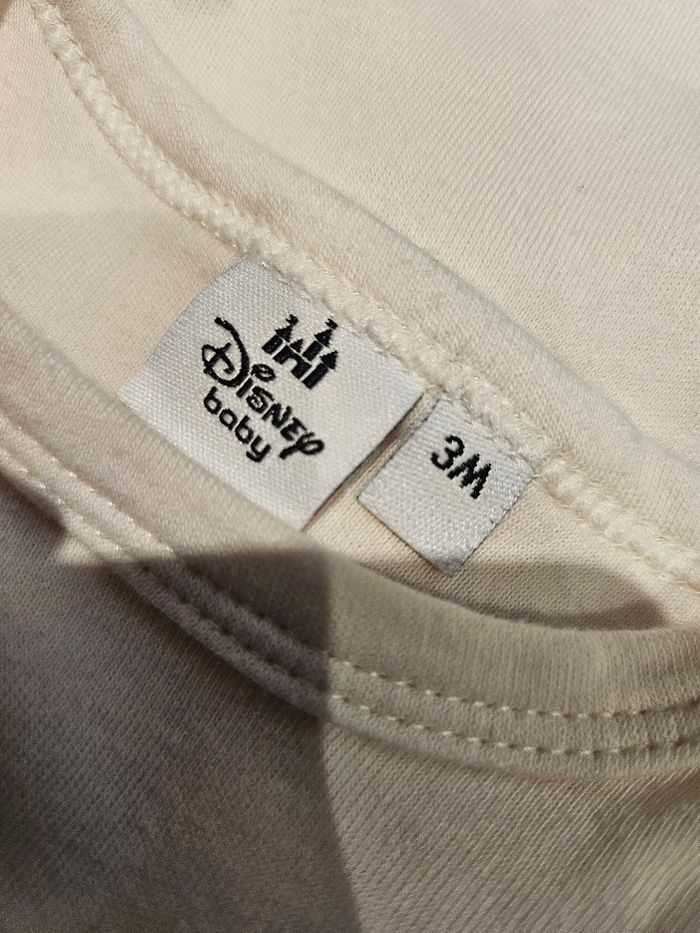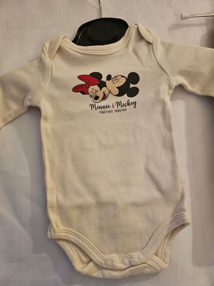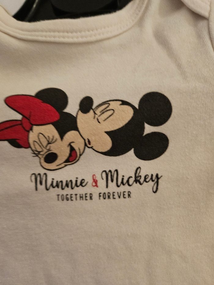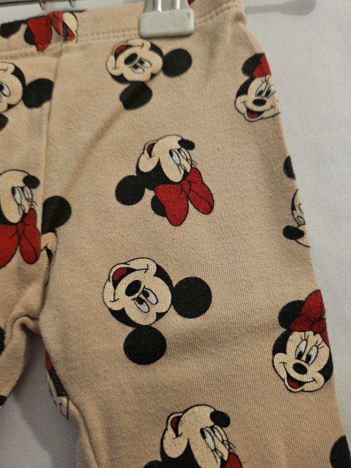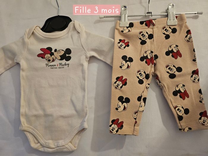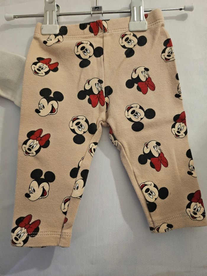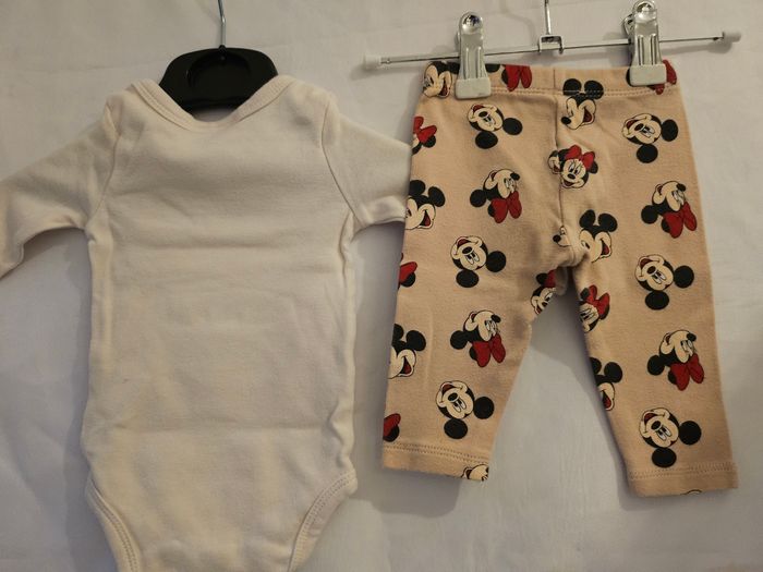 Ensemble deux pièces comprenant : - Body manches longues beige avec flocage Mickey Minnie. Passage par la tête. Jamais porté, juste lavé - Legging marron clair avec flocage têtes de Mickey et Minnie. Marque: Disney Baby Taille : 3 mois