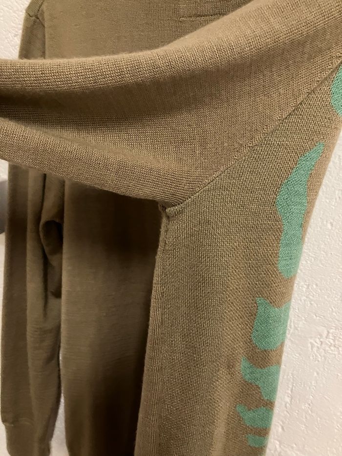 Pull Devred marron clair et vert avec un dessin d’une feuille. 50 % acrylique et 50 % laine. Col rond.