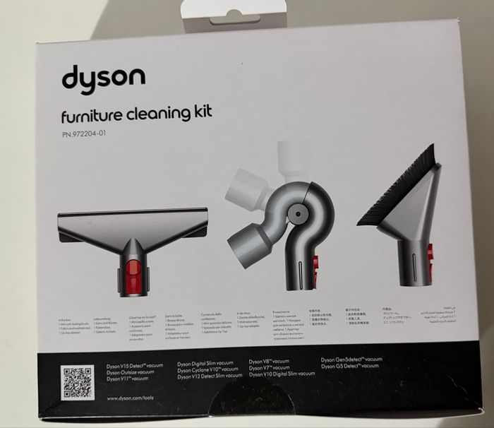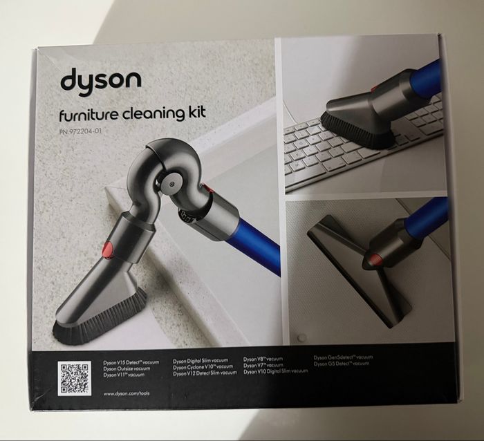 Dyson kit nettoyage pour meubles Des accessoires signés Dyson pour nettoyer les surfaces délicates de vos meubles sans les abimer. Conçue pour se fixer aux aspirateurs sans fil de la gamme Dyson Outsize™, Dyson V15™, Dyson V12™, Dyson V11™, Dyson Cyclone V10™, Dyson V8™ et Dyson V7™.