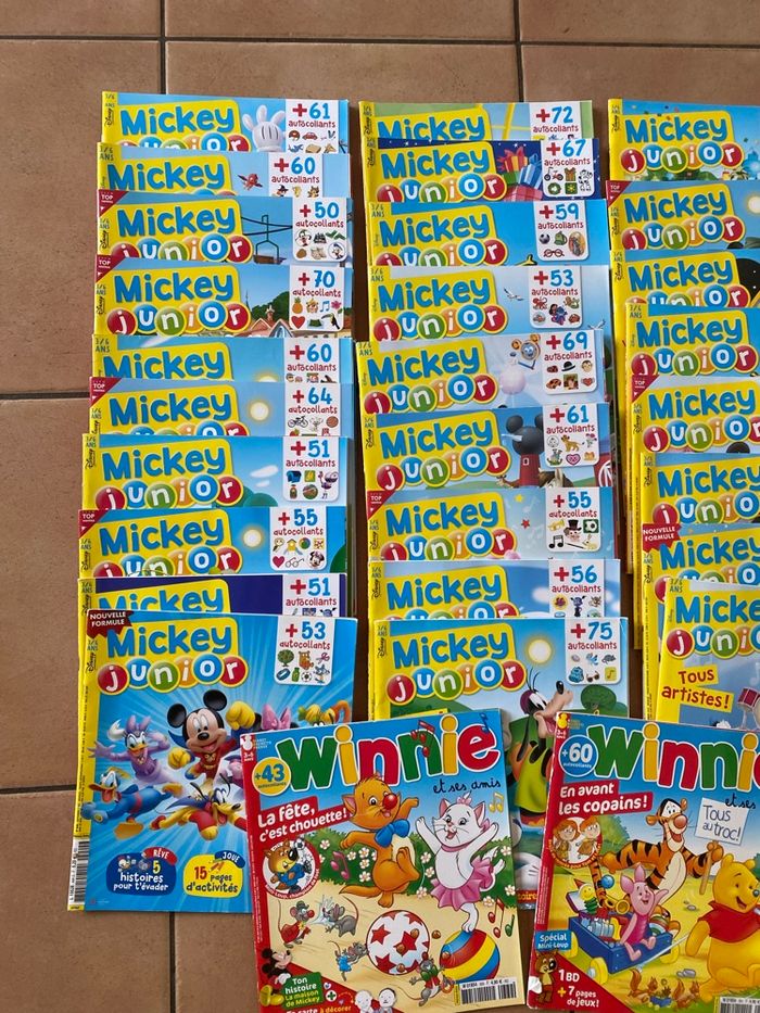 Lot de magazines : 27 Mickey junior et 2 Winnie et ses amis. Les jeux sont faits sur certains Certains sont en très bon état et d’autres en bon état.