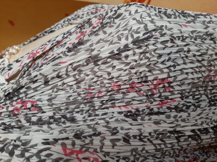 Blouse neuve avec étiquette, confectionnée dans un tissu léger et fluide, à motif de petites feuilles noires et touches florales roses sur fond blanc, écru. Le tissu légèrement transparent, ce qui lui donne un aspect aérien. Coupe et style Elle présente une coupe ample, avec des manches longues et un bas légèrement évasé. Le haut de la blouse est finement plissé depuis les épaules jusqu’au milieu, créant un joli effet de volume et de texture. Le col est froncé et peut être porté de deux façons : Ouverte au cou (voir les photos) : le lien est défait, laissant apparaître une encolure en V souple. Fermée par un lien : le lien est noué au niveau du col, créant un effet plus fermé et structuré. Polyvalence. Matière : légère et agréable à porter,100 % polyester. Mesures : aisselles 56 cm, bas 70 cm, hauteur 64 cm. Pas de remise en main propre. Ce type de blouse peut se porter de manière décontractée avec un jean ou plus habillée avec une jupe ou un pantalon élégant. Le lien au col permet de varier le style selon l’occasion.