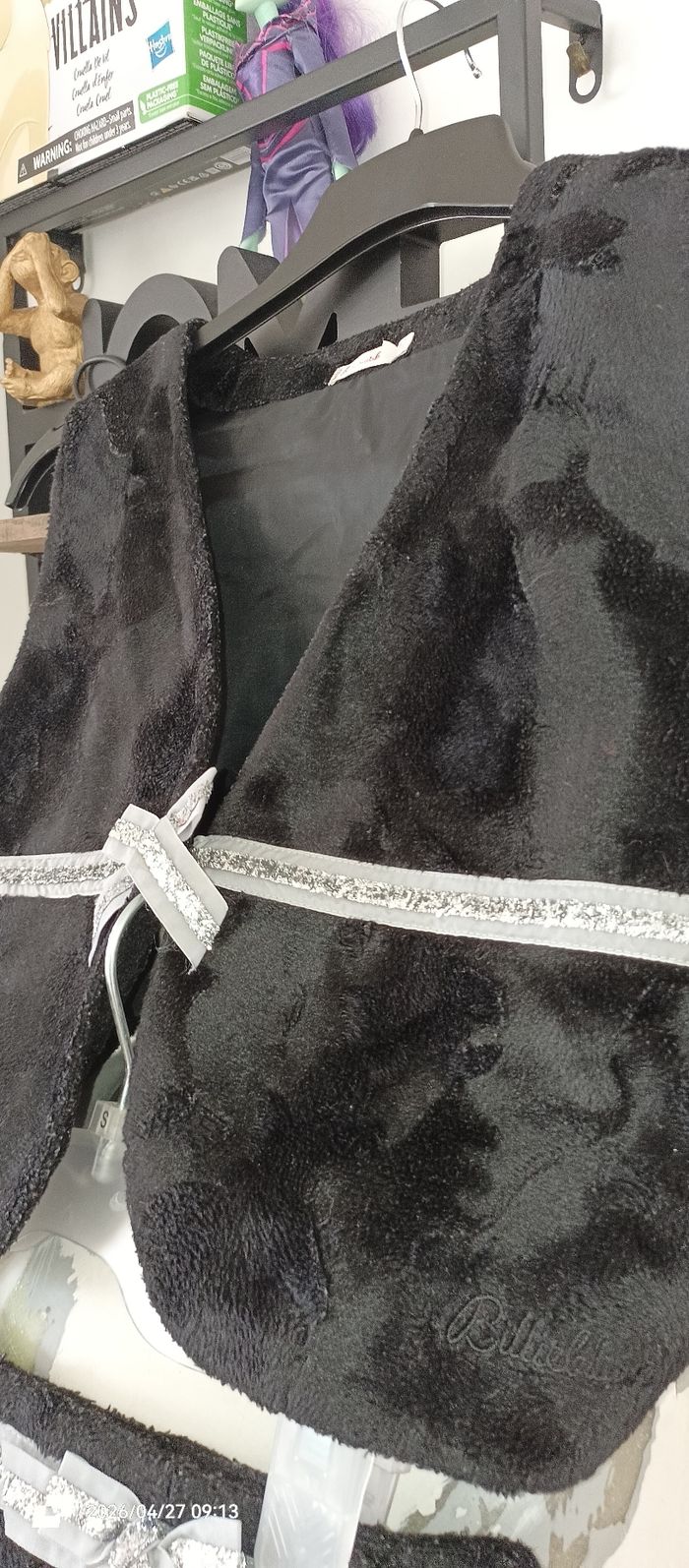 Bonjour Je vend cet ensemble gilet et jupe noir velours et ceinture noeud argentée. A été porté quelques fois. Merci Taille 11 ans car le 12 taille petit.