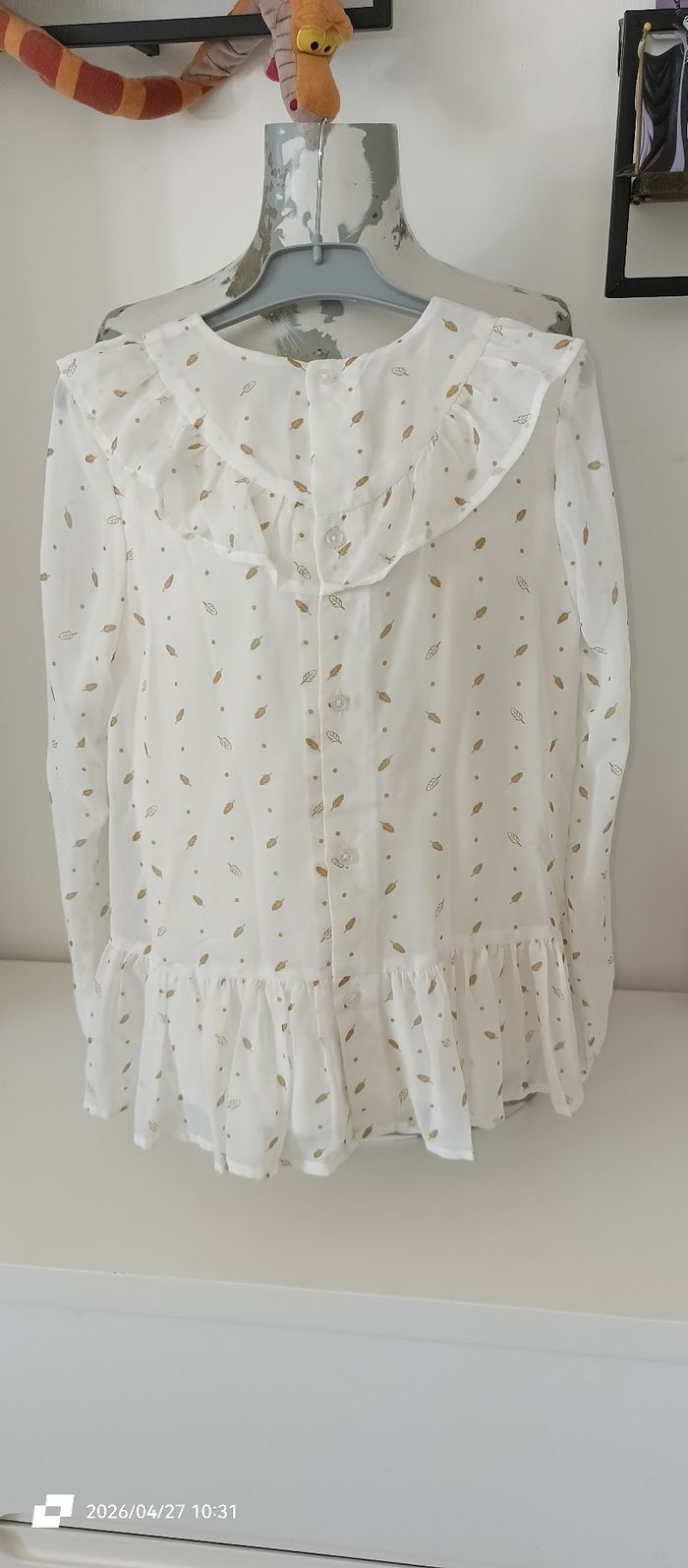 Bonjour Je vend cette blouse doublée sauf les manches Blanche et feuilles, pois dorés Boutons dans le dos Merci