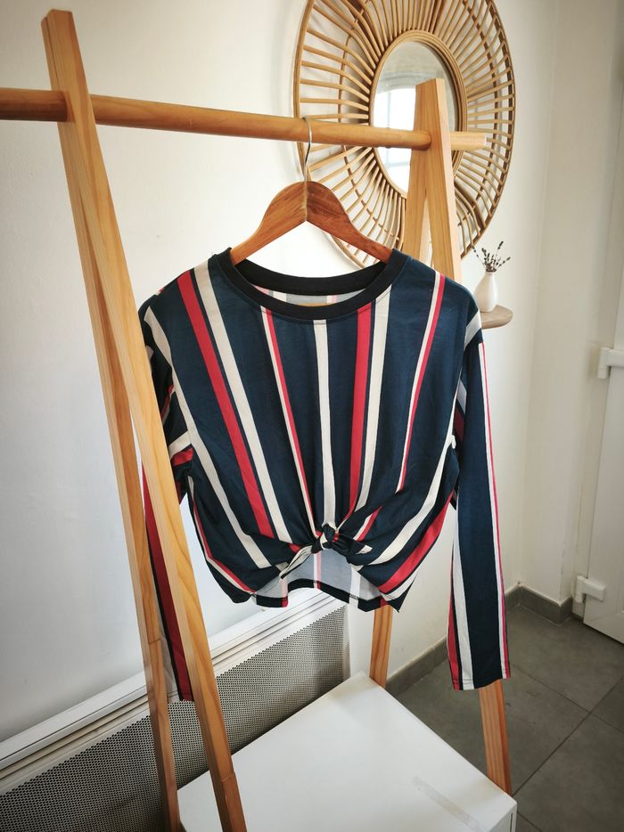 Lot comprenant 3 hauts aux coloris marine, blanc et rouge: -un top imprimé épaules dénudées -un top a manches longues rayé à nouer -une chemise rayée