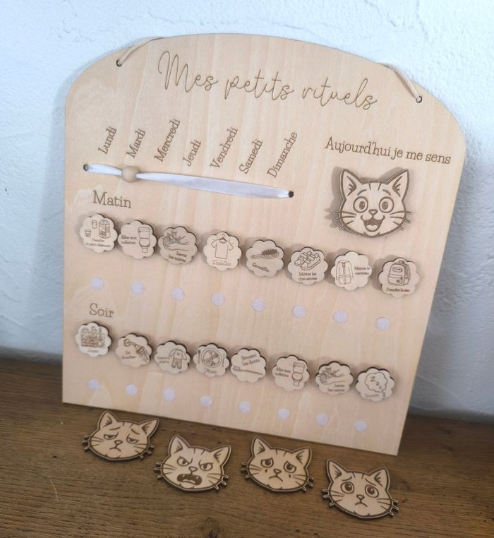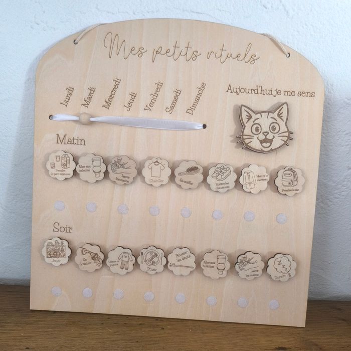 Tableau des rituel Avec les jours de la semaine, 5 têtes émotion (joie tristesse colère peur fatigue) 8 routines du matin ainsi que 8 routines du soir Différentes routines et tête émotion disponibles 28,5 cm x 30 cm
