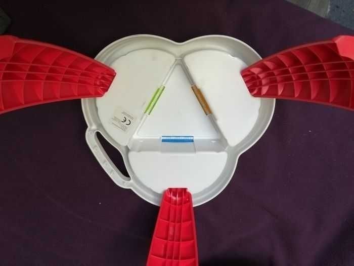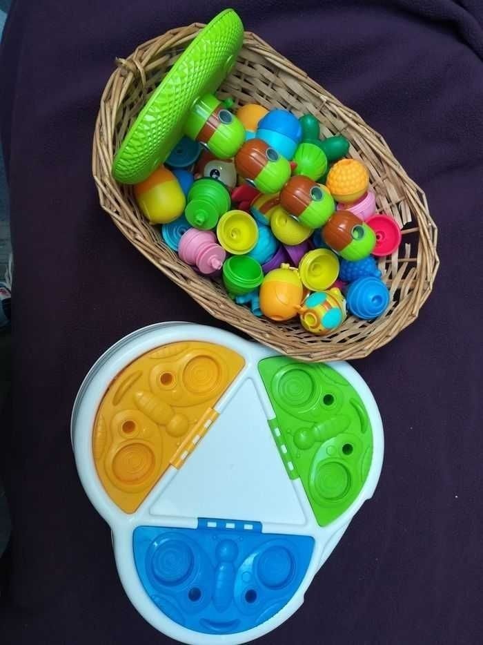 Superbe lot de jeux Lalaboom : Une vingtaine de doubles perles de toutes les couleurs Deux fleurs 3 animaux : écureuil, abeille, oiseau 5 imités animaux : tortue, abeille, oiseau Arbre en 4 perles neuf Table support, avec 3 rangements Un pied un peu abîmé (voir photo) mais tient toujours debout et peut être utilisée En bon état, mais pas neuf