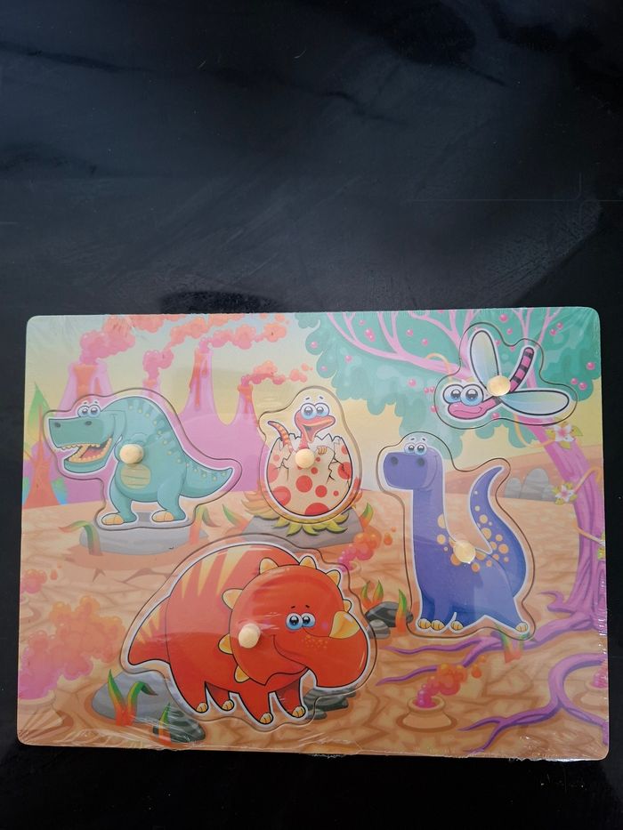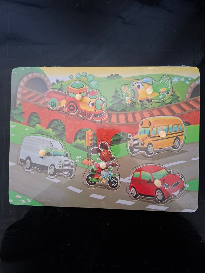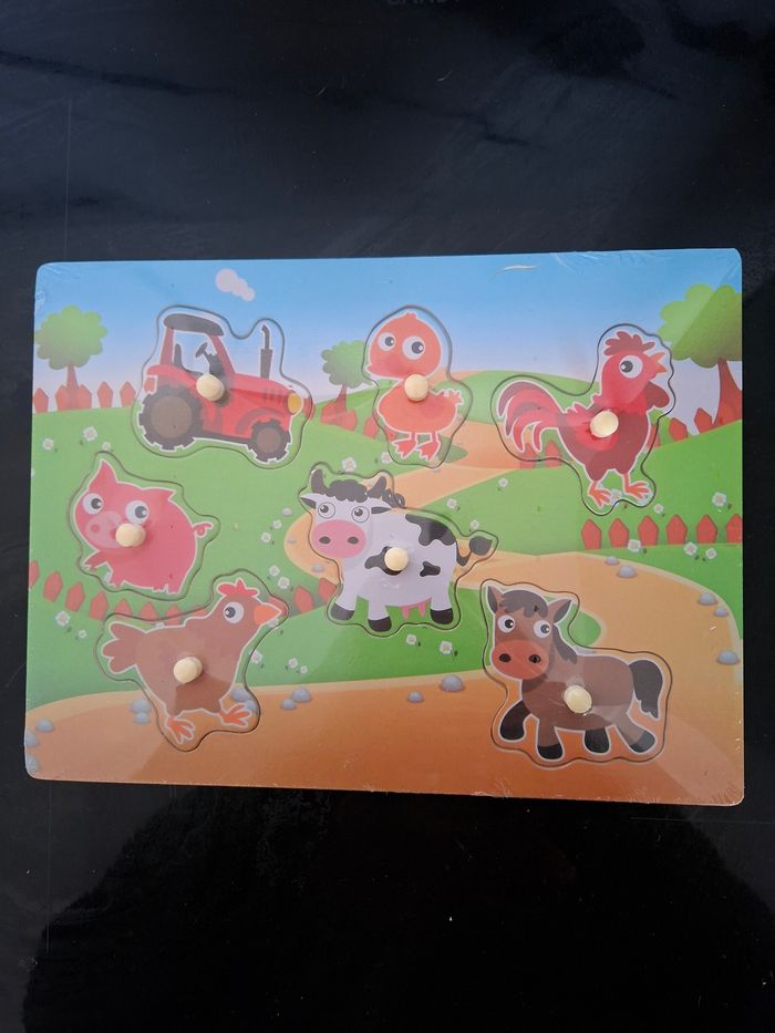 1 lot de 3 puzzles en bois. Animaux de la ferme + Vehicules + dinosaures. Age minimum 12 mois. Neuf jamais déballé.