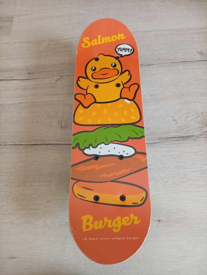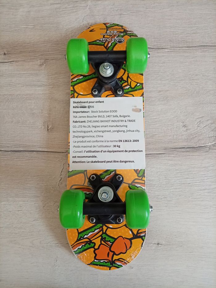Skateboard en bois pour enfant, compact et coloré, avec un motif original poussin 🐥 et hamburger 🍔 🛹 Caractéristiques : Dimensions : 43 x 12,5 cm Format idéal pour les enfants / débutants Léger et facile à transporter Design fun et ludique Plateau en bois / roues en plastique 👶 Adapté pour : enfants débutants 📦 État : neuf sous emballage plastique 💡 Parfait pour : Première initiation au skate Activité en extérieur Cadeau original 📍 Envoi rapide