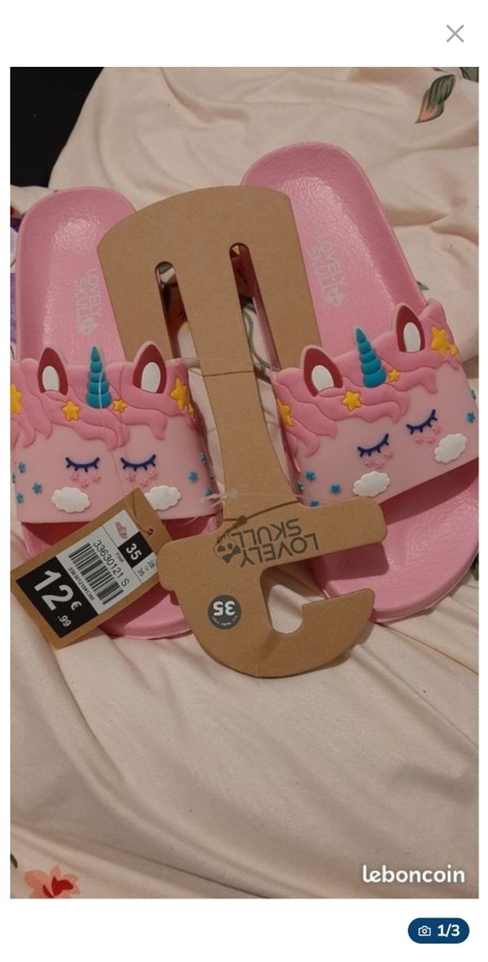 Je vends cette paire de claquettes fille licorne de C&A. Parfaites pour l'été, ces sandales allient confort et design ludique avec leur motif licorne adorable. - Type de produit : Claquettes - Univers : Enfant - Marque : C&A - Pointure : 35 - Couleur : Rose / Fuchsia - Design : Licorne avec détails colorés (corne, yeux, nuages) - Accessoires inclus : Boîte d'origine N'hésitez pas à me contacter si vous avez des questions !