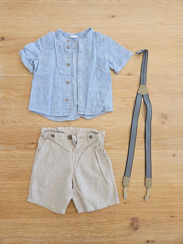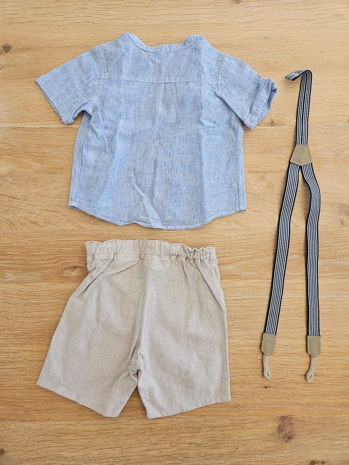 Ensemble short, chemisette, bretelles en lin Taille du short réglable Chemise col Mao Bretelles élastiques. Elles se fixent avec les boutons sur le short.