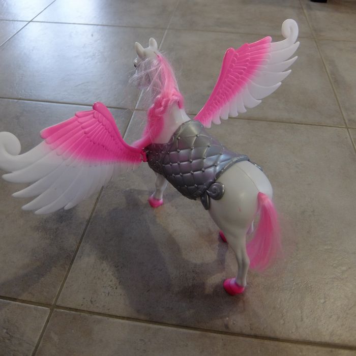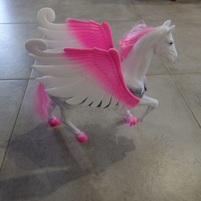 Cheval Pégase en plastique blanc et rose Je crois que c'est Barbie la marque Les ailes se déploient et se referment Hauteur: 27cm Crinière qui peut être coiffée.