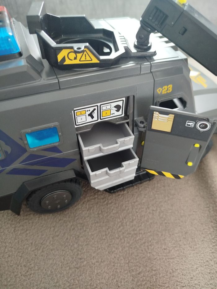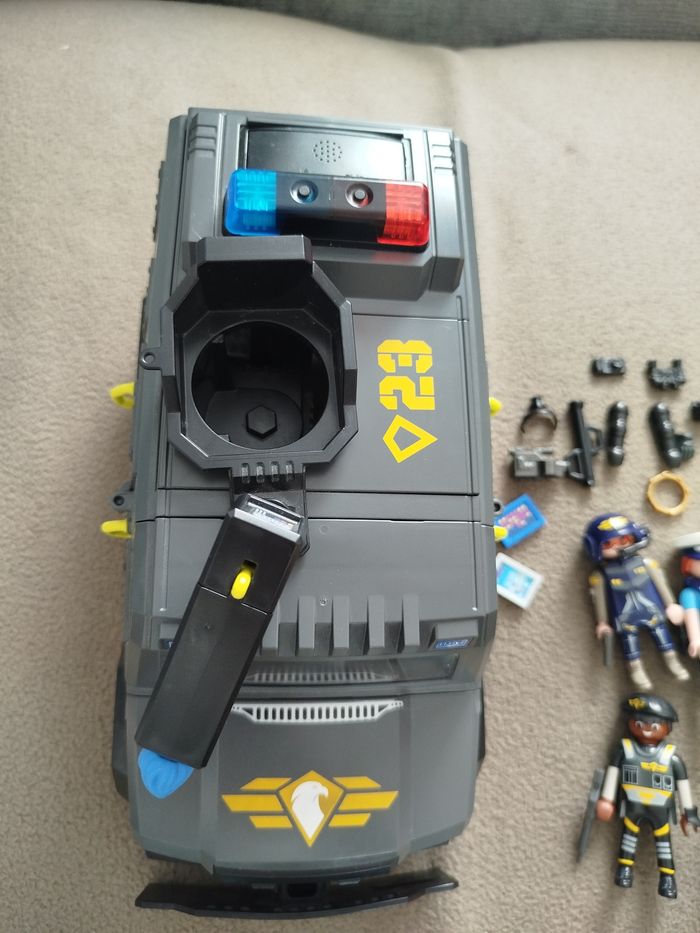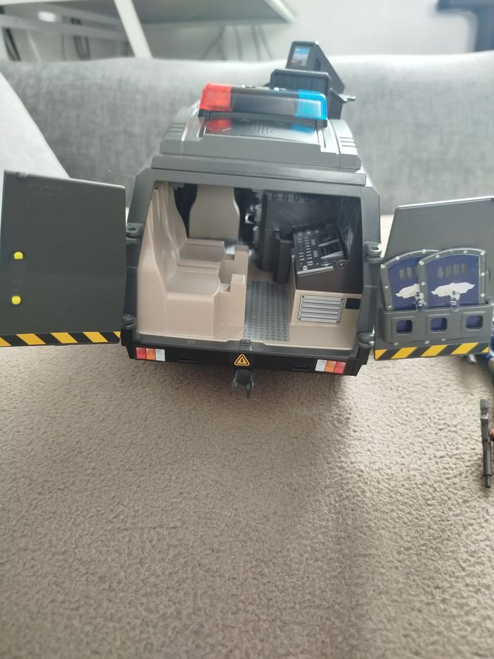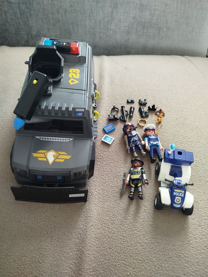 Véhicule d'intervention des forces spéciales playmobil. Vendu avec tout ce qu'il y a sur les photos. Véhicule en très bon état.