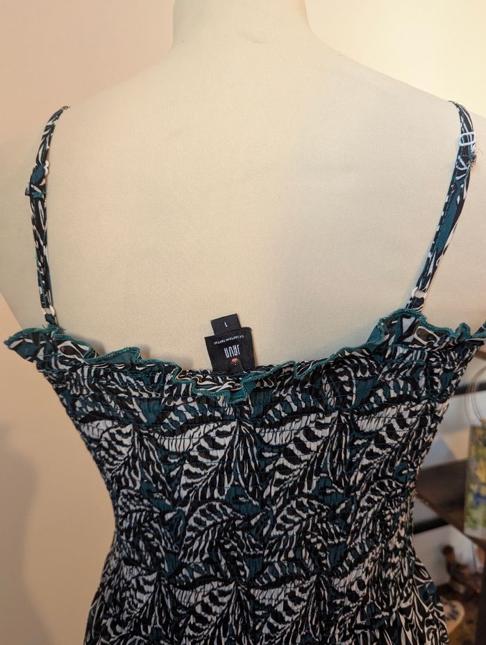 Robe imprimée à fine bretelles réglables portée une seule fois Smockée jusqu'à la taille Bande volantée sur le bas et petit volant sur tout le haut de la robe Longueur 122cm Couleurs vert émeraude, noir et blanc Doublée sur la partie jupe