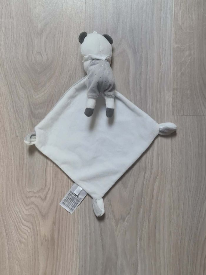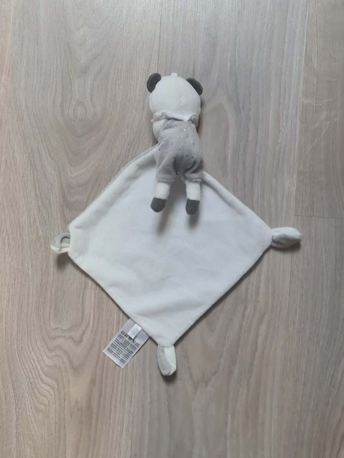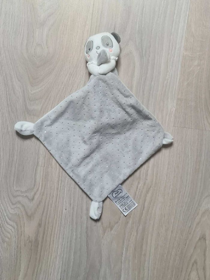 Doudou plat panda avec poids tissu mots d'enfants blanc argenté