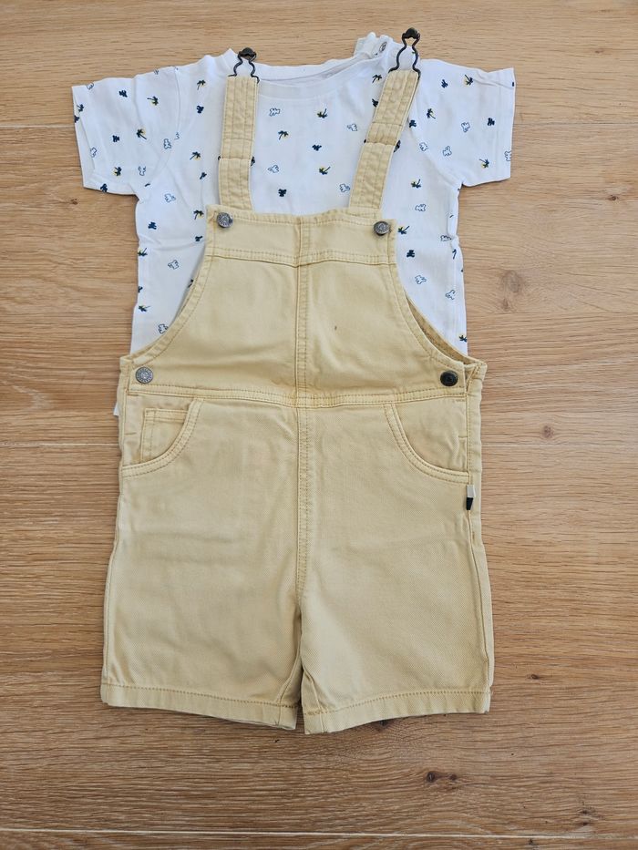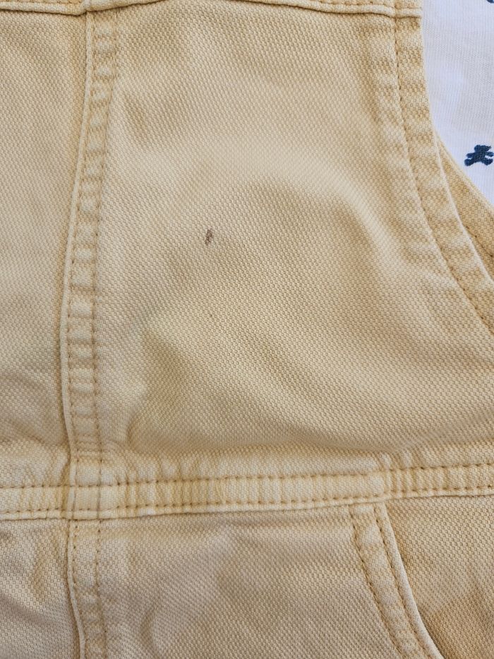 Salopette sans ouverture entre les jambes Petite tâche sur le ventre (voir photo) Tee-shirt fermeture par pressions à l'épaule