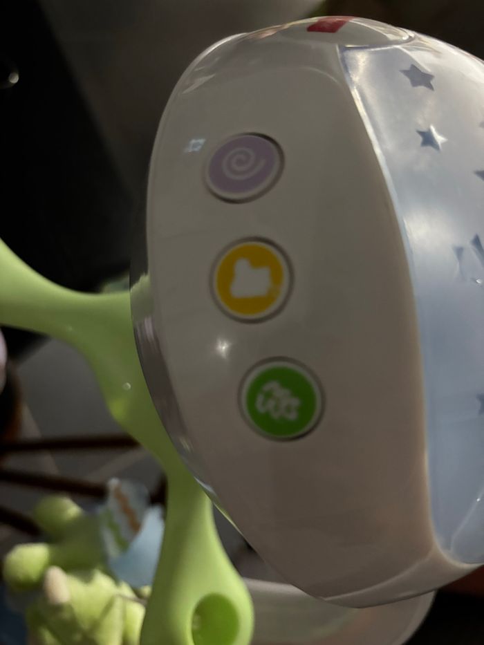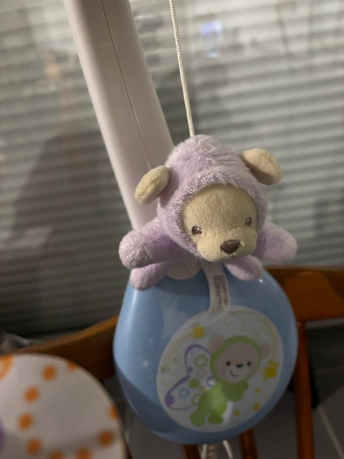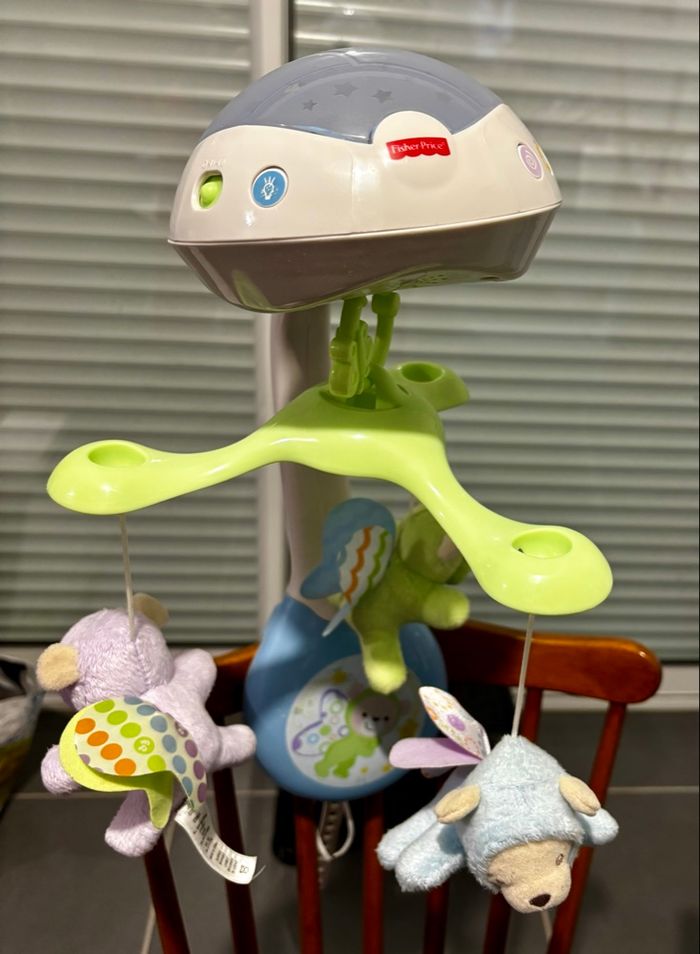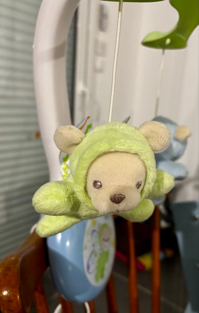 Mobile Fisher price en bon état de fonctionnement. Les oursons tournent et il y a de la musique, des bruits blancs ou bruits de la forêt. 1 bouton un peu effacé, voir photo