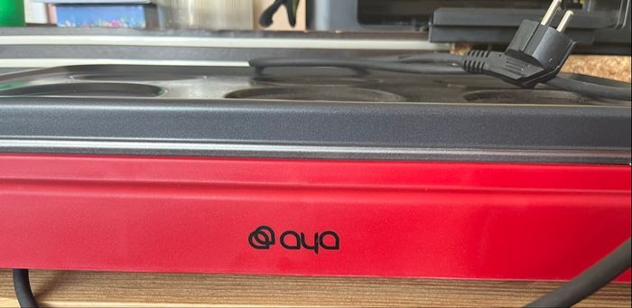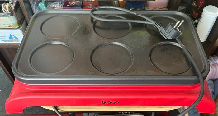 Je vends cette crêpière électrique rouge Aya avec 6 emplacements. Parfait pour préparer des crêpes en famille ou entre amis ! - Type de produit : Crêpière électrique - Marque : Aya - Couleur : Rouge - Nombre d'emplacements : 6 crêpes Bon état, juste marquée par le graissage avant cuisson, malgré le nettoyage, lors des quelques usages. Fonctionne parfaitement. N'hésitez pas à me contacter pour plus d'informations !
