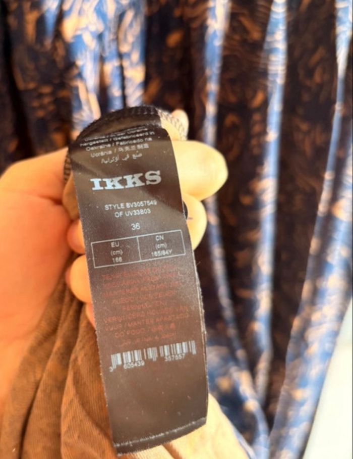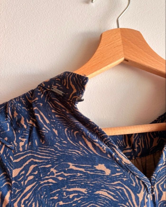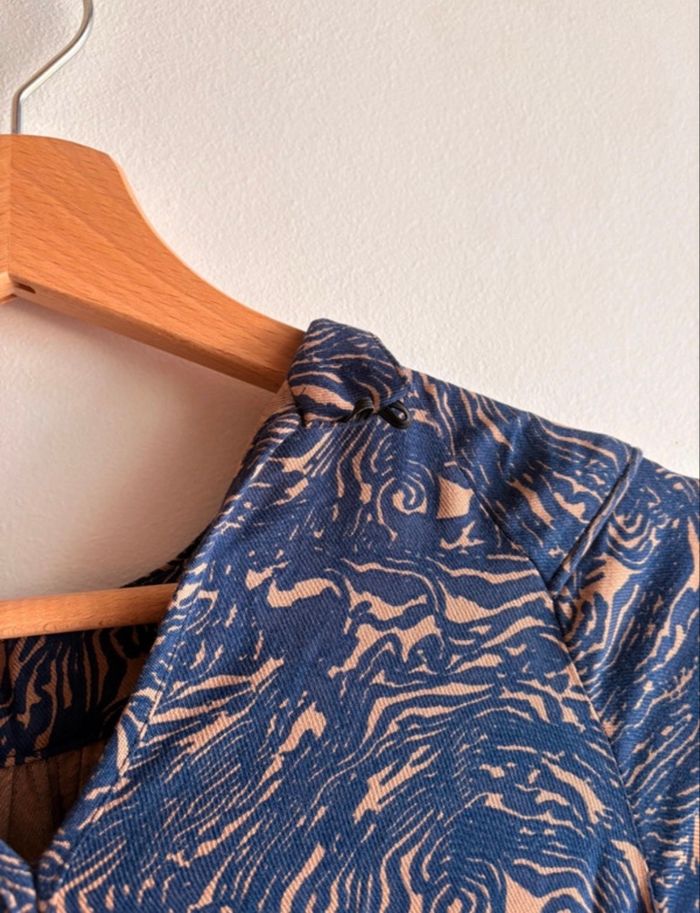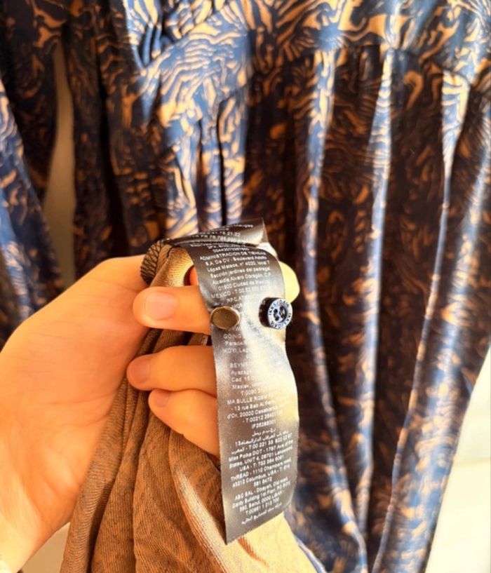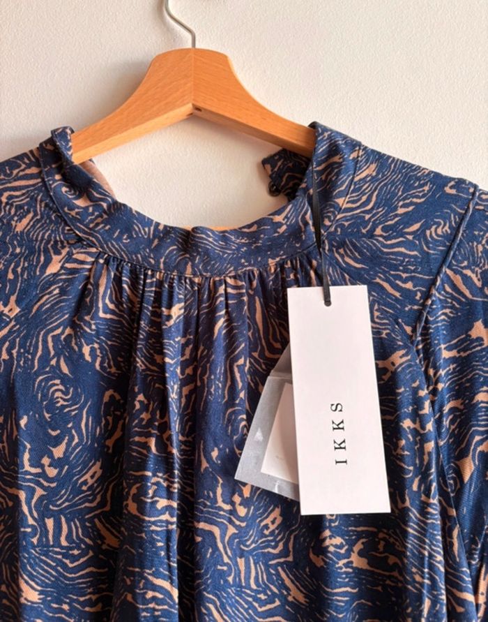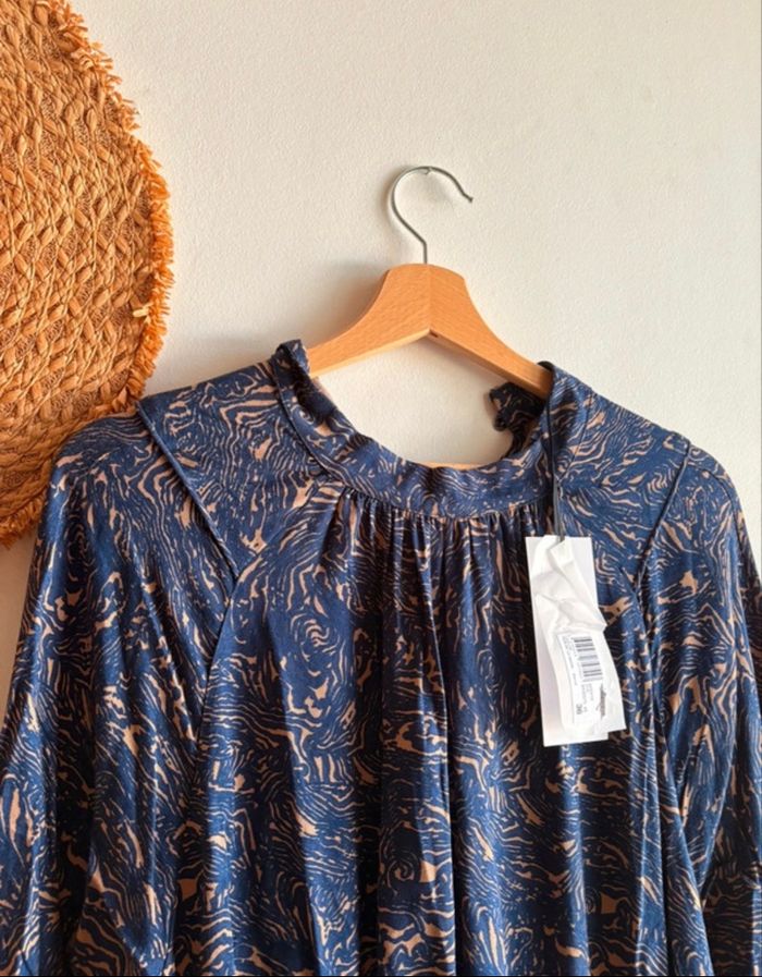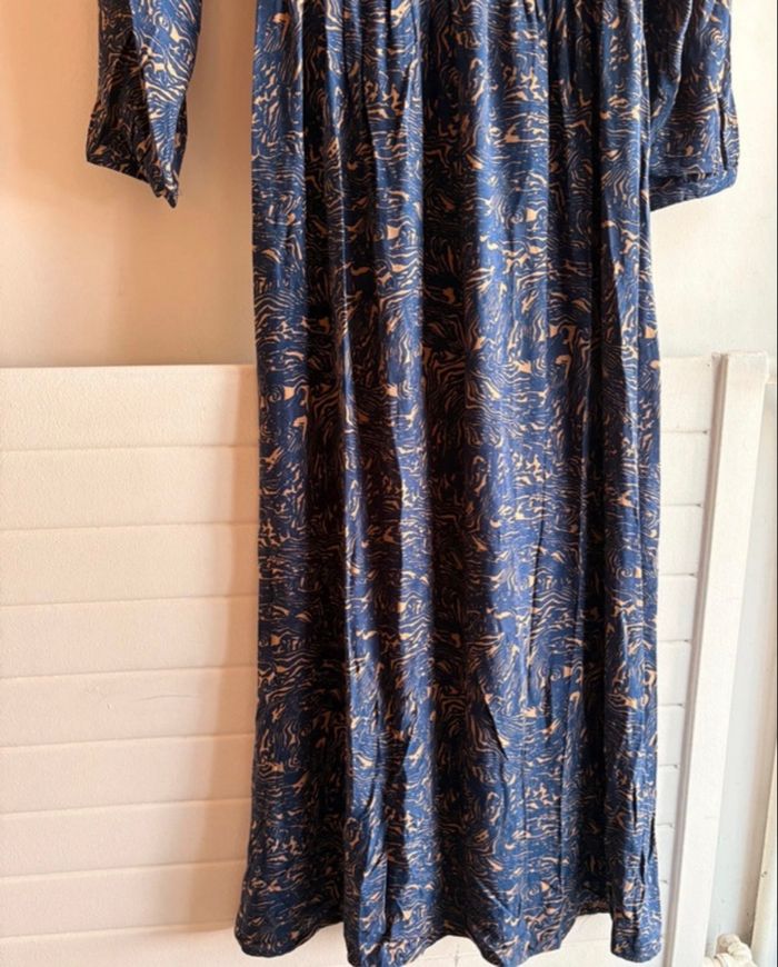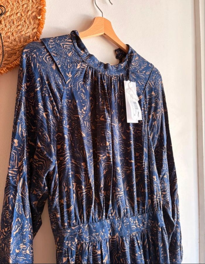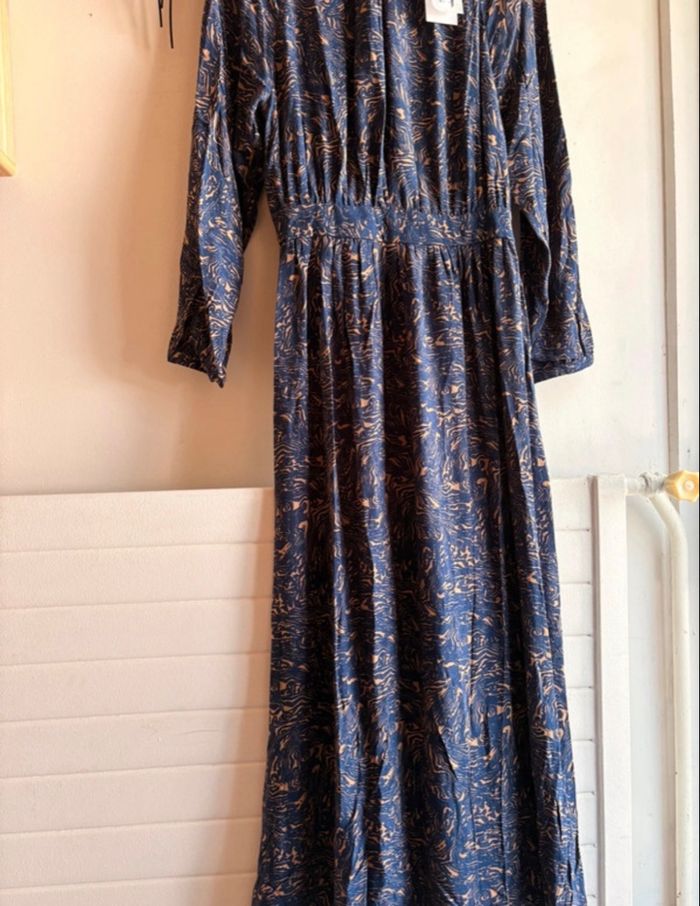 ✨ Robe longue IKKS bleu marine à motifs ✨ Superbe robe longue IKKS avec motifs abstraits bleu marine et beige, très élégante et originale. Coupe fluide avec taille élastique qui souligne la silhouette, col légèrement montant avec fermeture discrète et manches longues. Tissu léger et agréable à porter, parfait pour une tenue chic sans effort 💙 État : neuf avec étiquette 🏷️ Idéale avec des bottines, talons ou baskets pour un look à la fois casual et habillé. Petit défaut : Il faut recoudre les boutons du col.