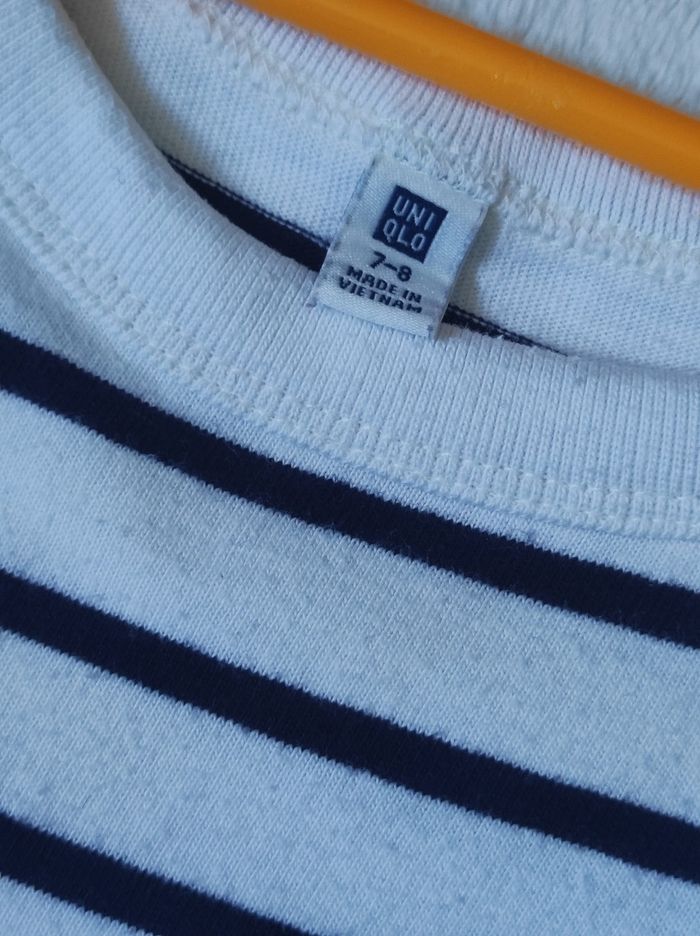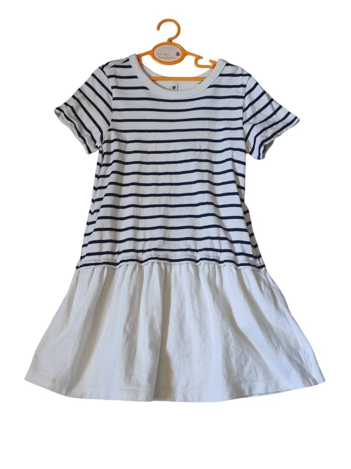 jolie petite robe courte à manches courtes. Partie basse de couleur blanche et haut de type marinière à petite bandes bleu marine avec des poches de côté bien cachée. 100% coton et 5% elasthane. Marque Uniqlo pour enfant en taille 7-8ans. A peine porter, en parfait état.
