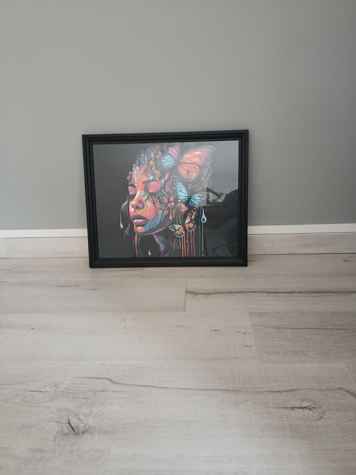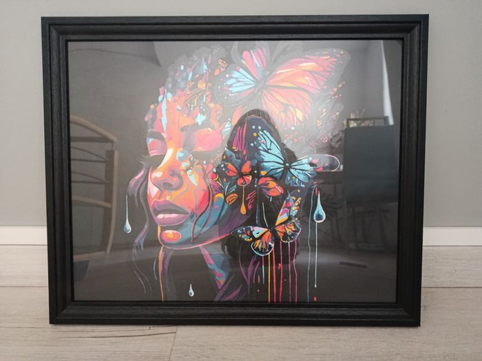 Peinture par numéros réalisée par mes soins. Environ 80 heures de travail. Représente un visage de femme Longueur : 55 cm Largeur : 45 cm