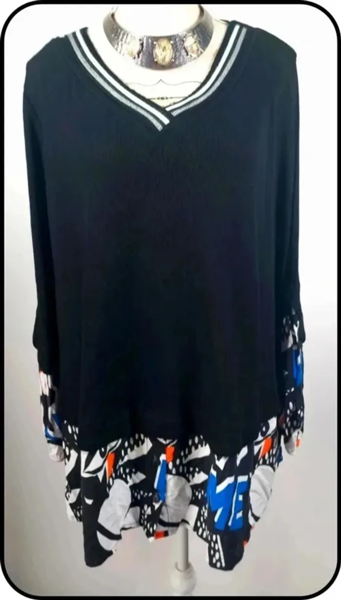 Pull avec effet superposition. Encolure en V bordé d'un bord cote rayé. Dessus en maille unie. Dessus du dos en maille unie avec fente au milieu. Dessous en viscose imprimé graphique avec patte et boutons. Manche 3/4. Haut de manche en maille unie. Bas de manche imprimé fini élastiqué. Neuf il coute 119 euros Composition et entretien : • Maille : 93% viscose, 7% élasthanne. • Bord cote : 80% polyester, 20% coton. • Dessous imprimé :100% viscose. • Lavable en machine en suivant les instructions disponibles sur le produit. Fabrication : • Tshirt grande taille fabriqué en France. Poitrine: 128-134 cm Taille: 108-114 cm Hanche: 130-136 cm #mode #vêtements #haut #pull #imprimé #style #tendance #fashion #lookdujour #ootd #tenuedujour #vêtementsfemme #chic #élégance #graphique #confort #modeféminine #fashionista #shopping #instafashion #madeinfrance
