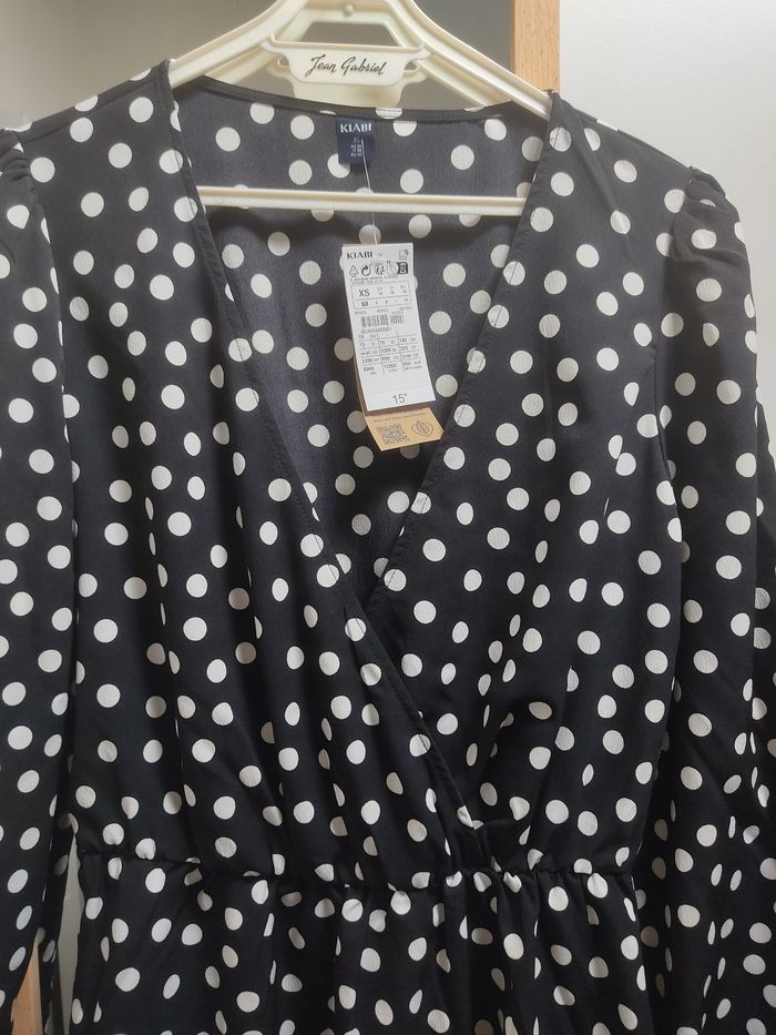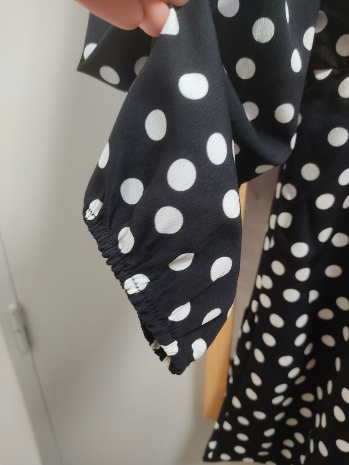 Neuve avec étiquette. Taille et bout des manches avec élastiques. Noire à pois blancs