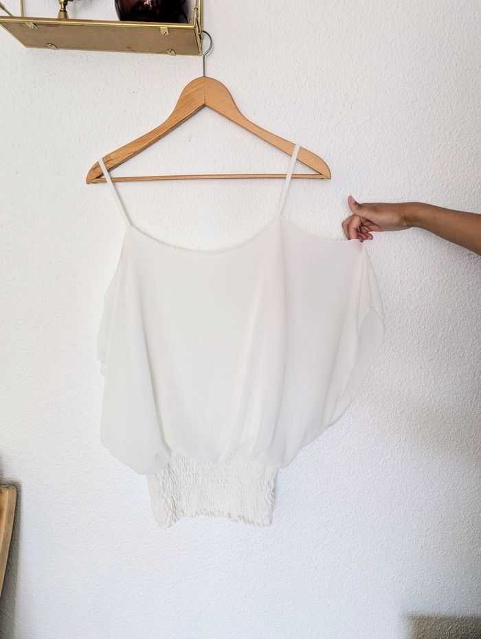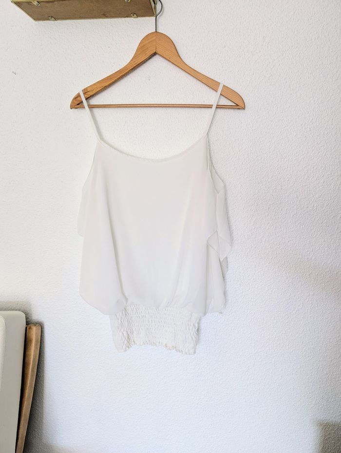 Top fluide blanc effet vaporeux , léger , agréable à porter avec fines bretelles et bas elastiqué qui marque la taille. Doublé donc pas de transparence Taille unique , peut convenir du S au L