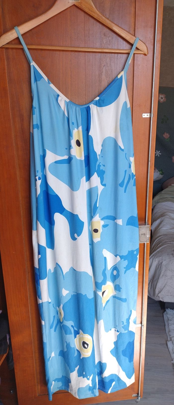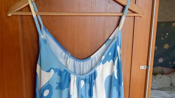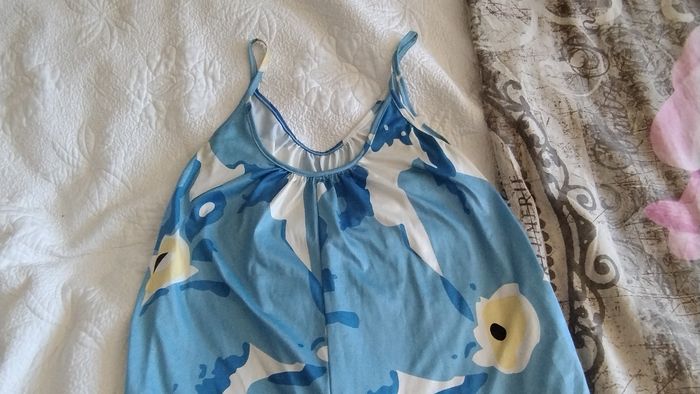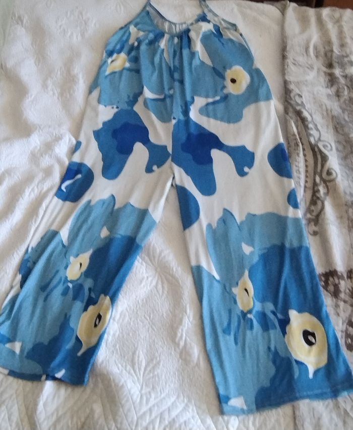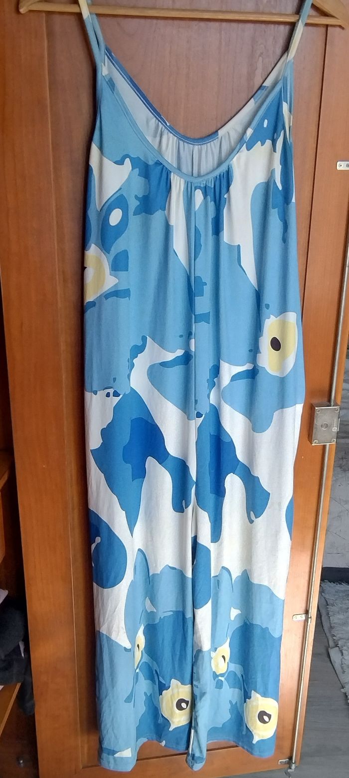 Combinaison fluide et large. Fines bretelles. Couleurs/ imprimé: grandes fleurs bleu pâle, moyennes fleurs bleu roi, petites fleurs jaunes pâle, sur fond blanc. Très bon état, pas de tâche ni de trous. Marque inconnue. Taille unique, convient à un M ou un L.