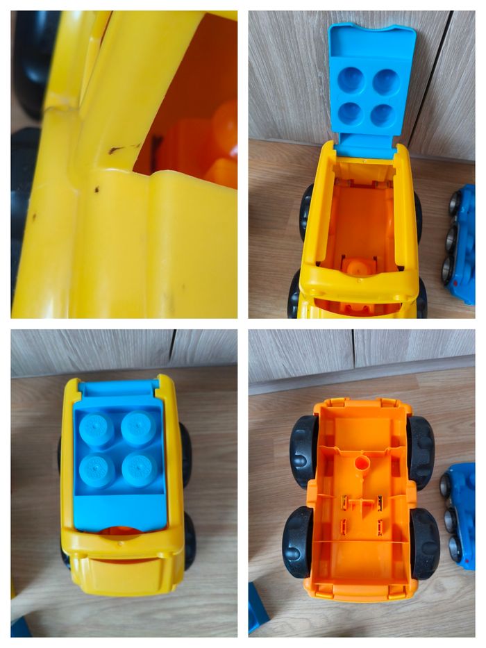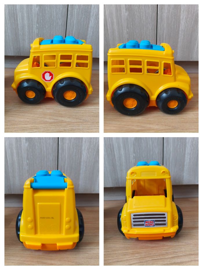 Le lot comprend tout ce qui est en photo. - un bus, tâche noir - 2 personnages, état satisfaisant ils ont perdu de leur peinture. - blocs de construction de différentes tailles (environ 56) - une base de véhicule - une voiture, elle a perdu un peu de peinture Le tout présente des traces de manipulation, rayures..