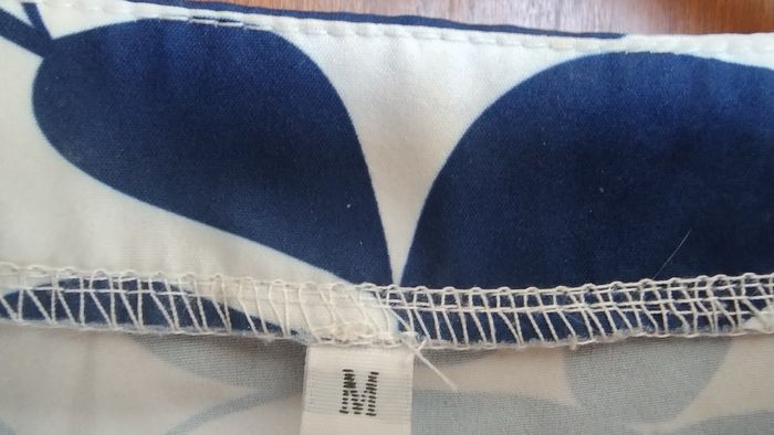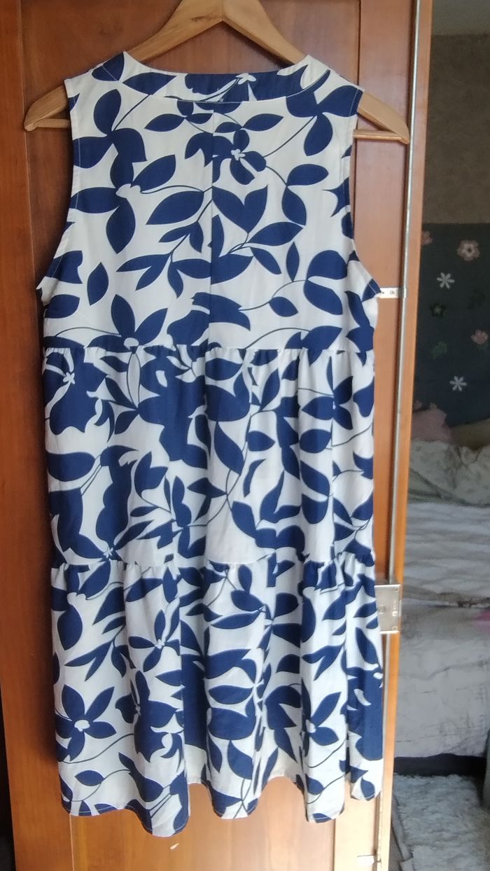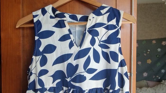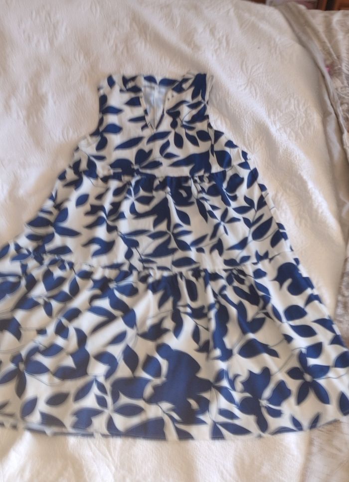 Petite robe sans manche. Encolure V. 3 étages Longueur genoux. Couleur/ imprimé: fond blanc- feuilles bleu roi. Taille M Marque: Sans. Très bon état : pas de trou ni de tâche.