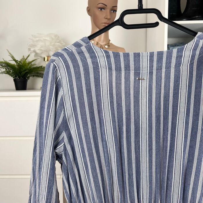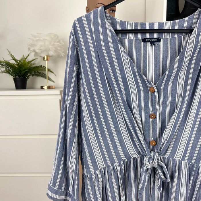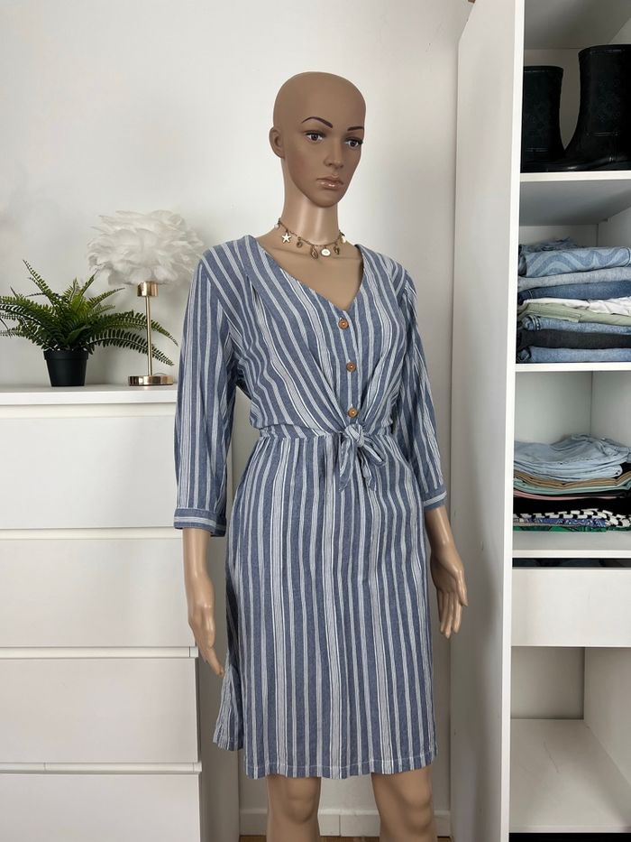 Robe aux rayures bleu et blanc Bonobo Parfaite pour un look décontracté, élégant au quotidien, printemps comme été. Une pièce intemporelle avec un nœud à la taille qui épouse joliment la silhouette. Taille 38 - M Couleur : Bleu chiné et blanc Motif : Rayures verticales Caractéristiques : Col V, manches 3/4 retroussables, élastique à la taille, nœud à la taille, boutons devant
