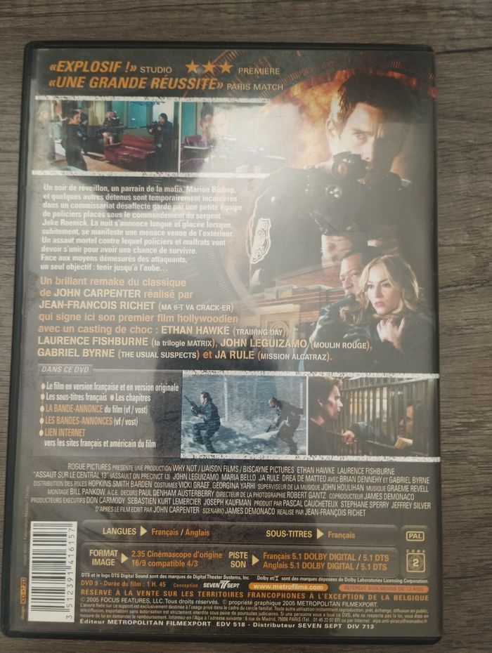 Réalisateur : Jean-François Richet Editeur : Metropolitan Film & Video Parution : 24/11/2005 Nombre de DVD : 1 Classification : Thriller Acteurs : Ethan Hawke - Laurence Fishburne - John Leguizamo - Maria Bello - Ja Rule - Gabriel Byrne - Brian Dennehy 3512391416157 Audio : Français Anglais #DVD #Assaut_sur_le_central_13 #Thriller Envoi Rapide sous enveloppe bulles Tous mes produits sont vérifiés, restaurés si besoin et nettoyés avant d'être expédiés ❤️ N'oubliez pas de vous Abonné pour être averti pour chaque Nouvelle Annonce