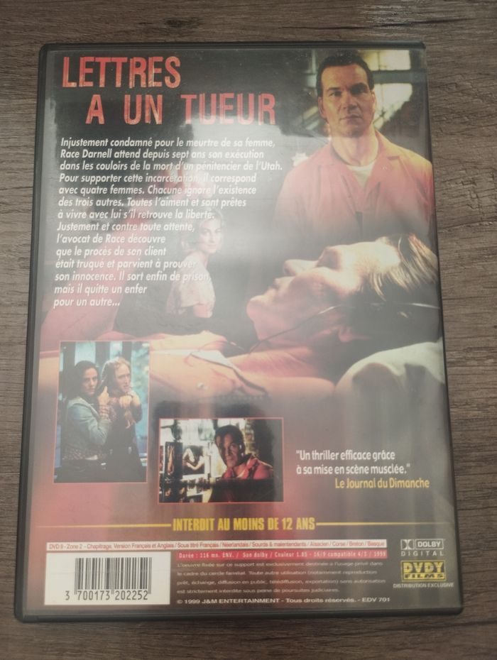 Réalisateur : David Carson Editeur : Opening Parution : 01/10/2002 Nombre de DVD : 1 Classification : Thriller Acteurs : Patrick Swayze - Gia Carides - Roger E. Mosley - Elizabeth Ruscio - Kim Myers 3700173202252 Audio : Français Anglais #DVD #Lettres_à_un_tueur #Thriller Envoi Rapide sous enveloppe bulles Tous mes produits sont vérifiés, restaurés si besoin et nettoyés avant d'être expédiés ❤️ N'oubliez pas de vous Abonné pour être averti pour chaque Nouvelle Annonce