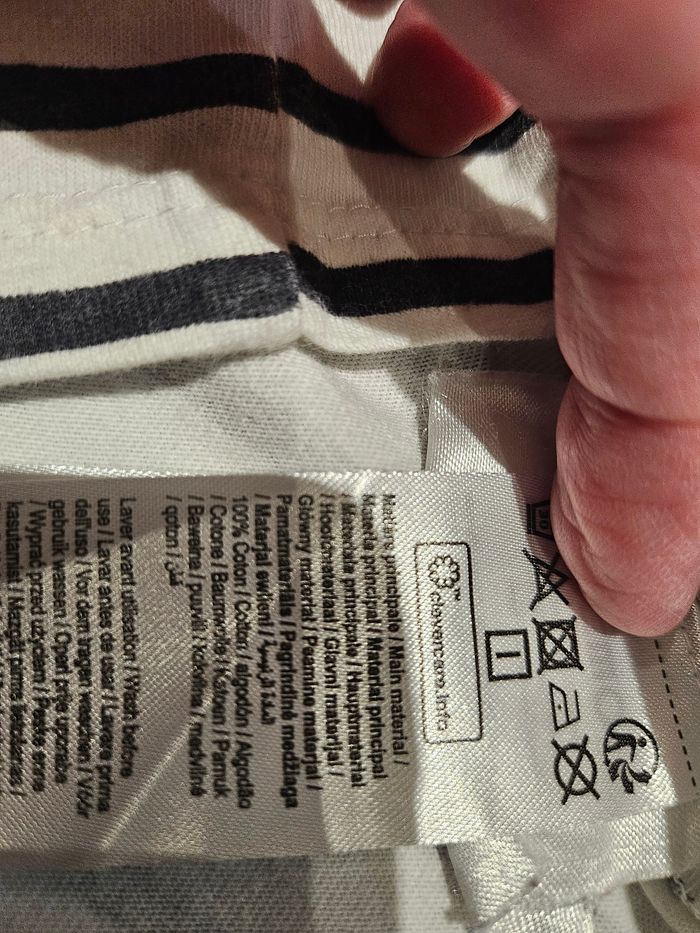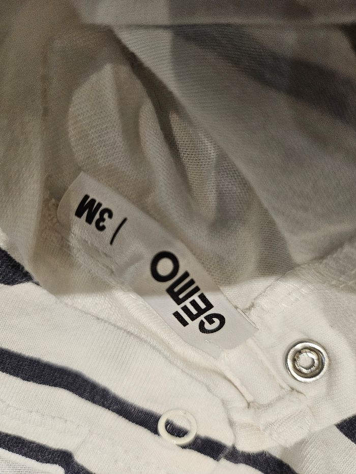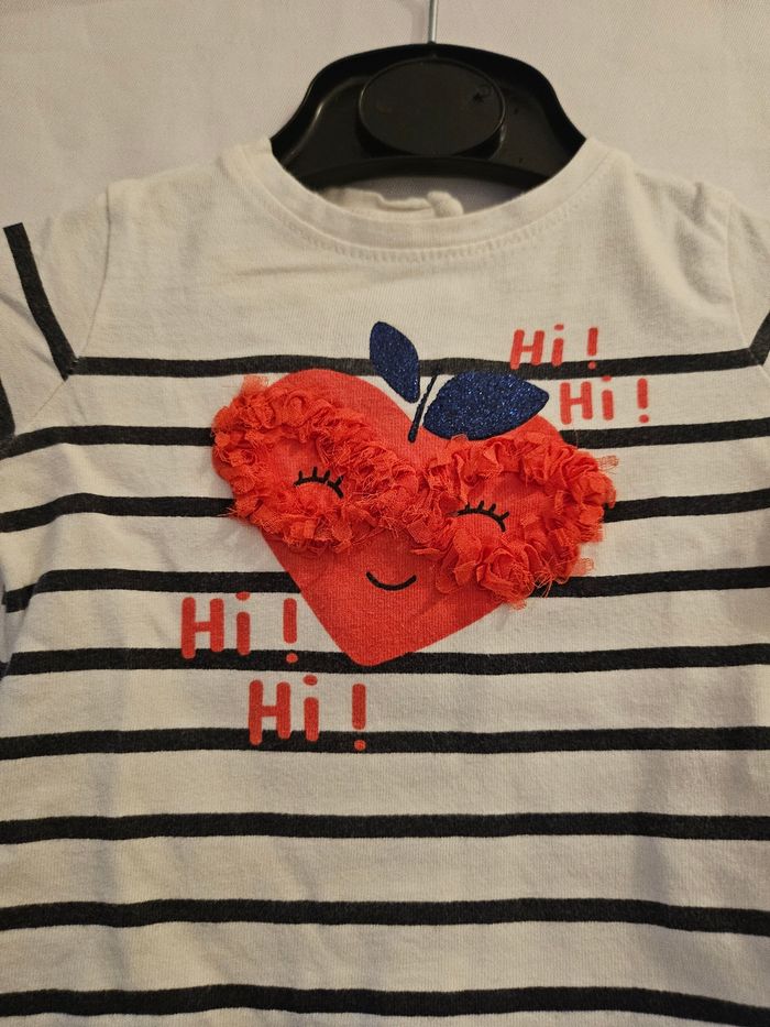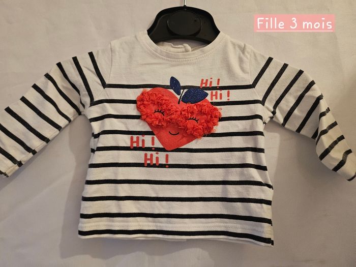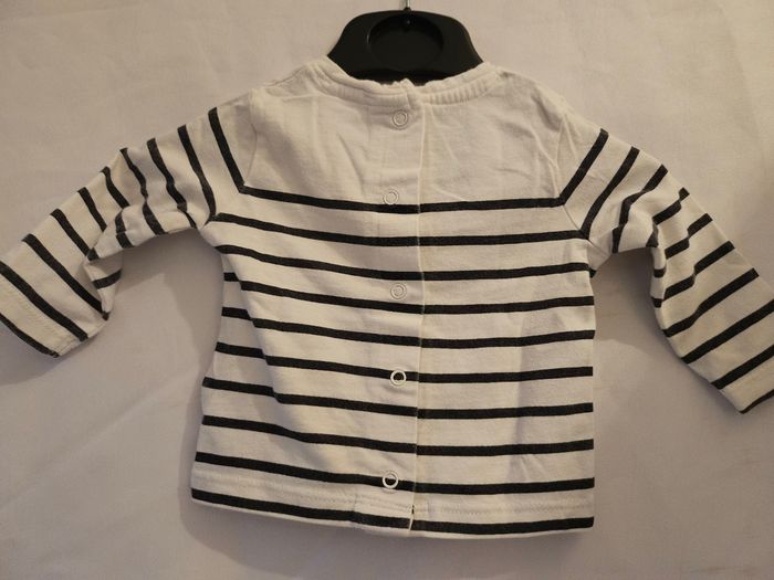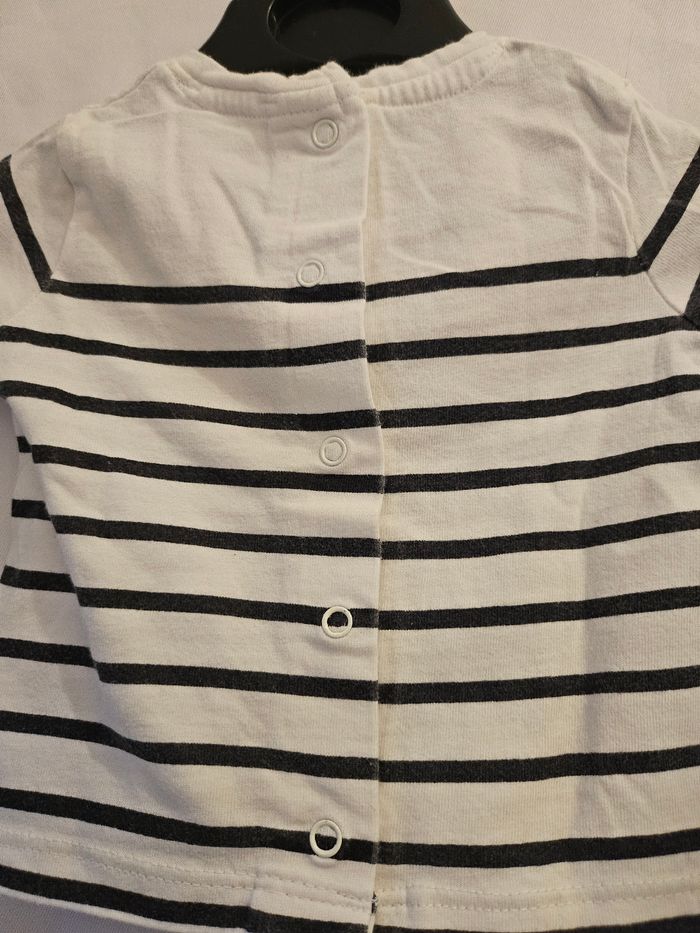 T-shirt manches longues blanc avec rayures bleues avec flocage devant et froufrous. Ouverture totale dans le dos par pressions. Marque : Gemo Taille : 3 mois