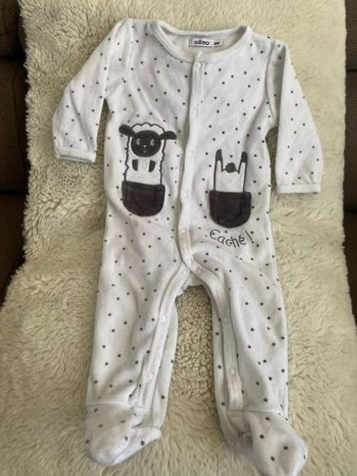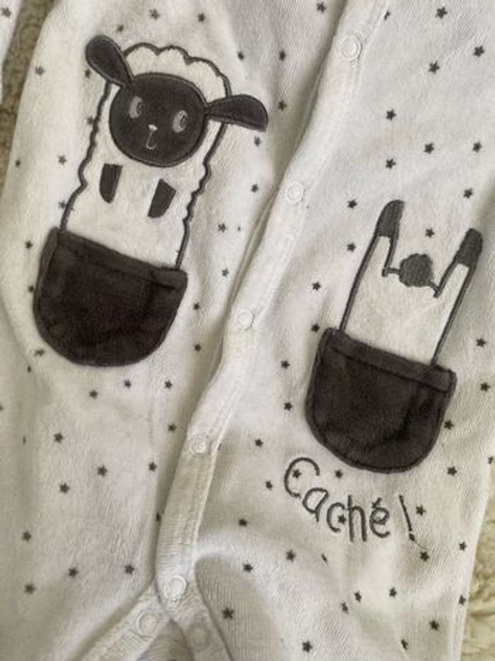 Pyjama en velours blanc, motifs étoile et mouton gris, taille six mois, en très bon état Ne pas hésiter à faire des lots de vêtements bébé
