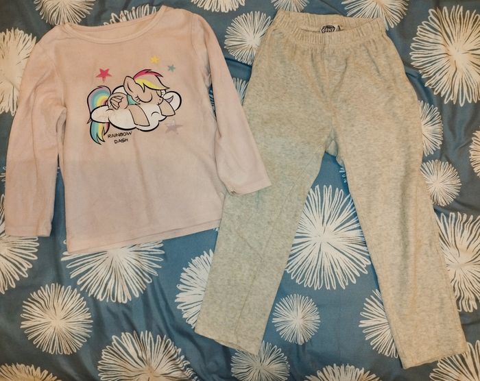 Je vends ce pyjama 2 pièces pour fille de 5 ans. Un ensemble confortable et mignon avec un motif arc-en-ciel sur le haut, parfait pour les nuits douces de votre enfant. - Type de produit : Pyjama - Univers : Enfant fille - Taille : 5 ans / 110 cm - Couleur : Rose et gris - Marque : My little pony - Caractéristiques : 2 pièces (haut manches longues + pantalon) - Motif : Arc-en-ciel et nuage sur le haut Le motif commence à "s'écailler" N'hésitez pas à me contacter pour plus d'informations ou de photos.