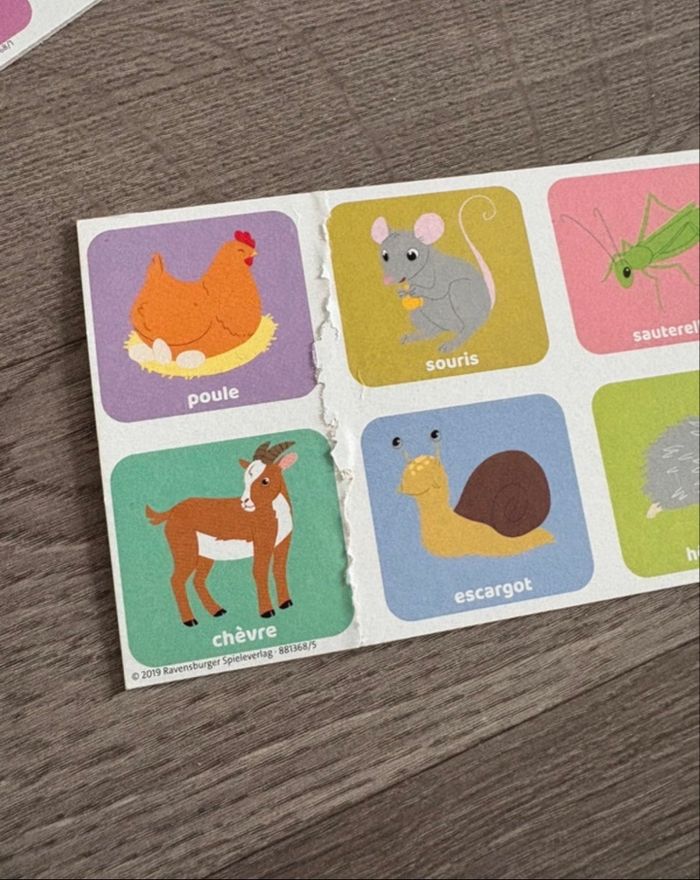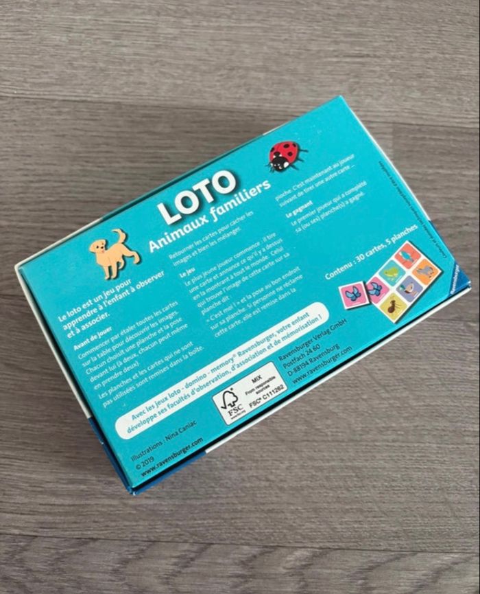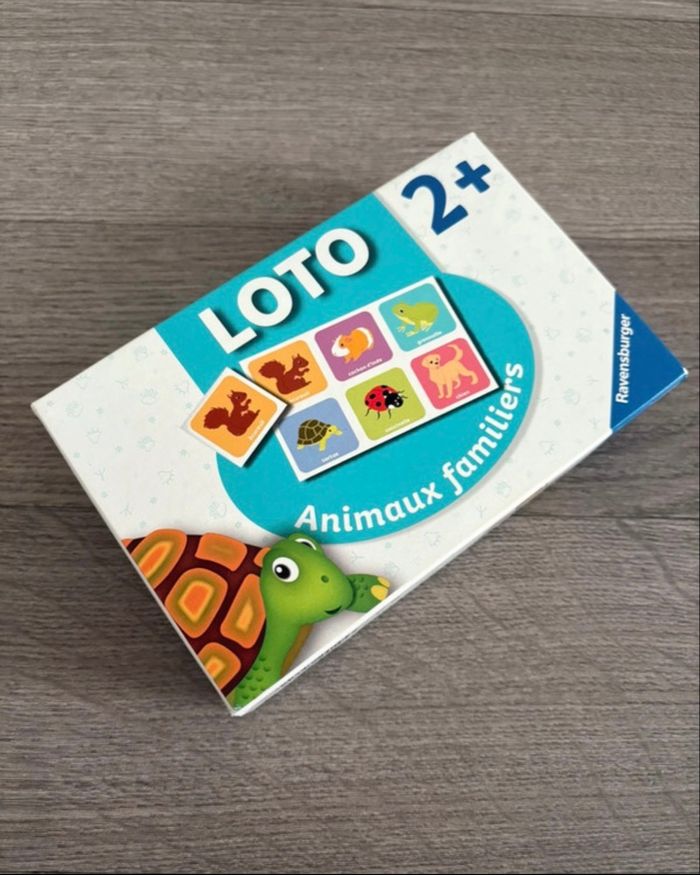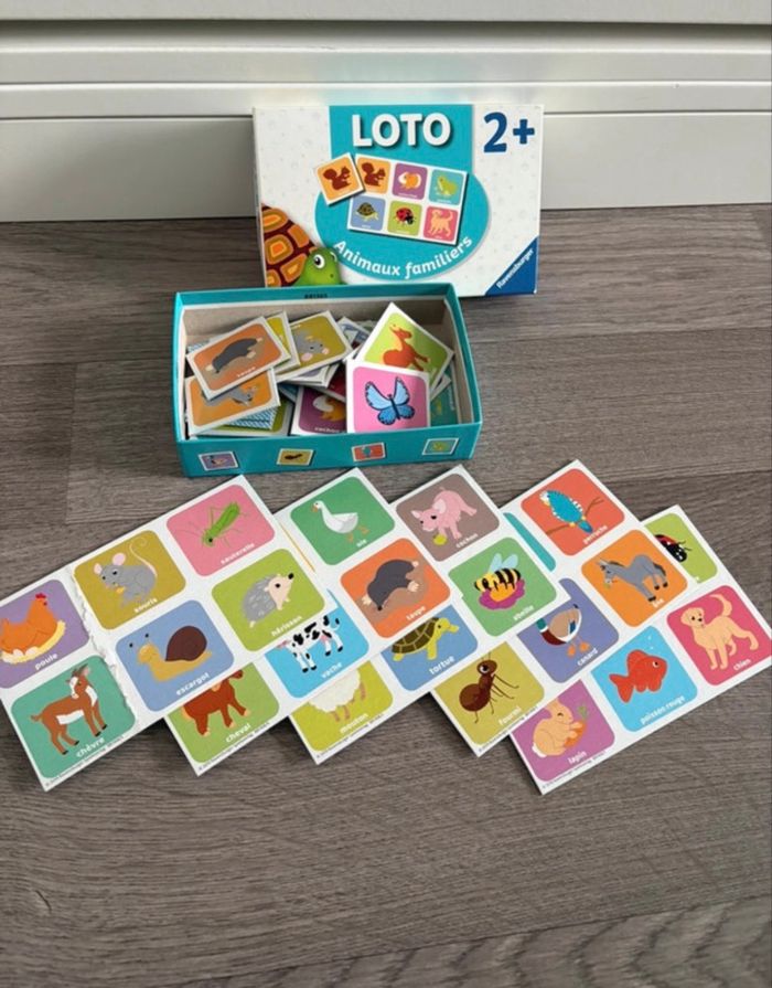 Loto animaux familiers À partir de 2 ans Très bon état général mais 1 carte abîmée (voir photo). N’empêche pas de jouer pleinement 🙂