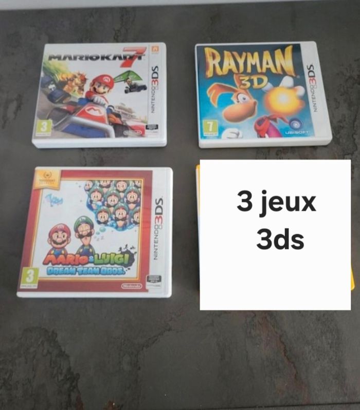 3 jeux 3ds Mario et luigi dream team Rayman 3d Mario kart Ces jeux ont tous ete acheté neuf en magasin Ce sont des 1ere mains Tres bon etat