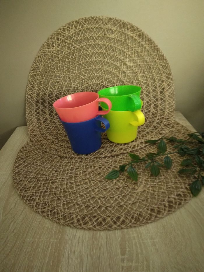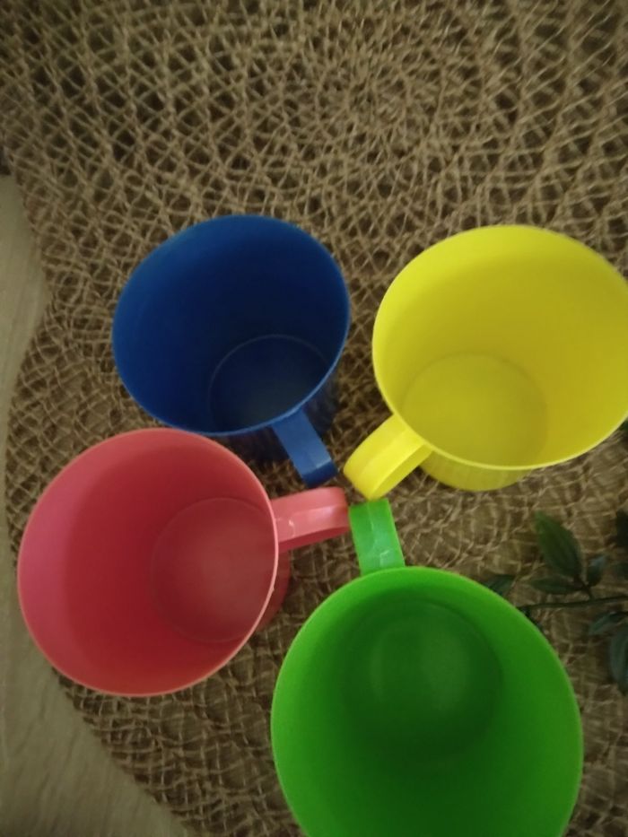 Lot de 4 gobelets en plastique avec anses. Rouge, jaune, vert et bleu. Bon état général Idéal pour les enfants ou pour des sortie piques niques, camping....