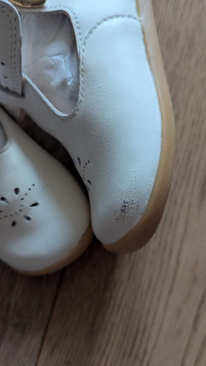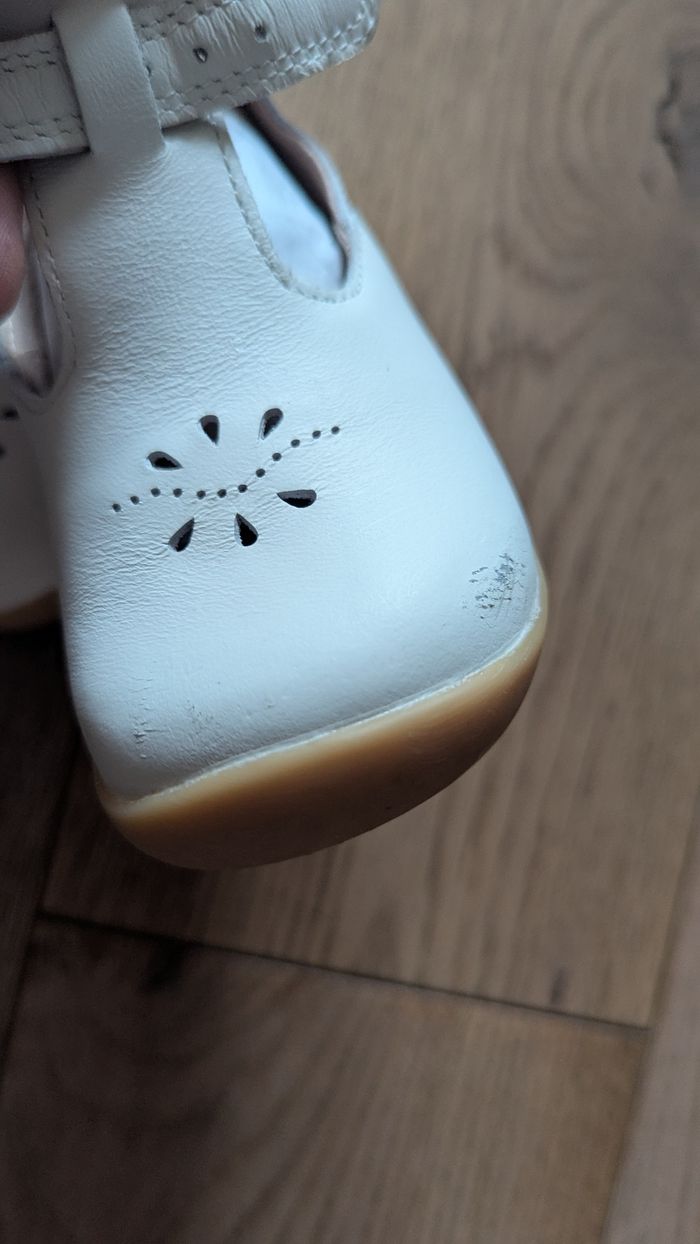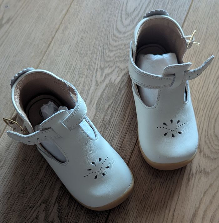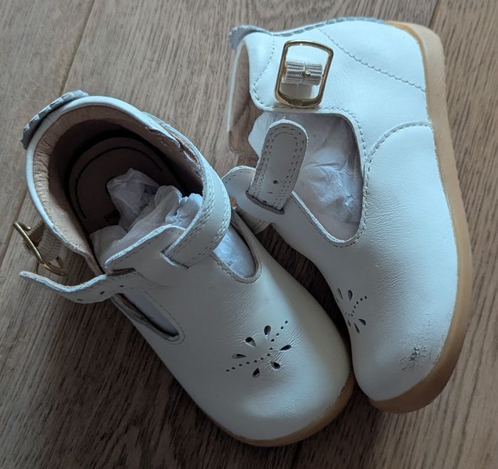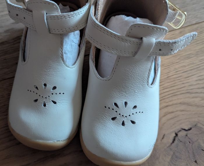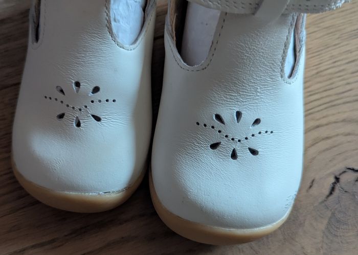 Bottillons Salomés en cuir souple pour premiers pas de la marque Vertbaudet. Portés 1 fois mais tombée 1 fois donc bout de chaussure éraflée (voir photos). Valeur neuve : 44,99€. - Forme adaptée à la morphologie des petits pieds pour favoriser les premiers pas en se rapprochant de la marche naturelle (pieds nus) - Cuir souple pour la liberté de mouvements et le soutien dont bébé a besoin pour trouver l'équilibre - Semelle avec bout remontant pour plus de souplesse et de résistance - Fermeture par boucle métal réglable montée sur élastique - Contrefort arrière rigide pour un bon maintien du pied - Contour de cheville rembourré - Soutien latéral pour le bon développement du pied - Témoin de croissance sur semelle intérieure amovible pour vérifier la pointure à tout moment. Composition : Dessus : cuir Doublure : cuir Semelle intérieure : cuir, amovible Semelle extérieure : élastomère, antidérapante, résistante