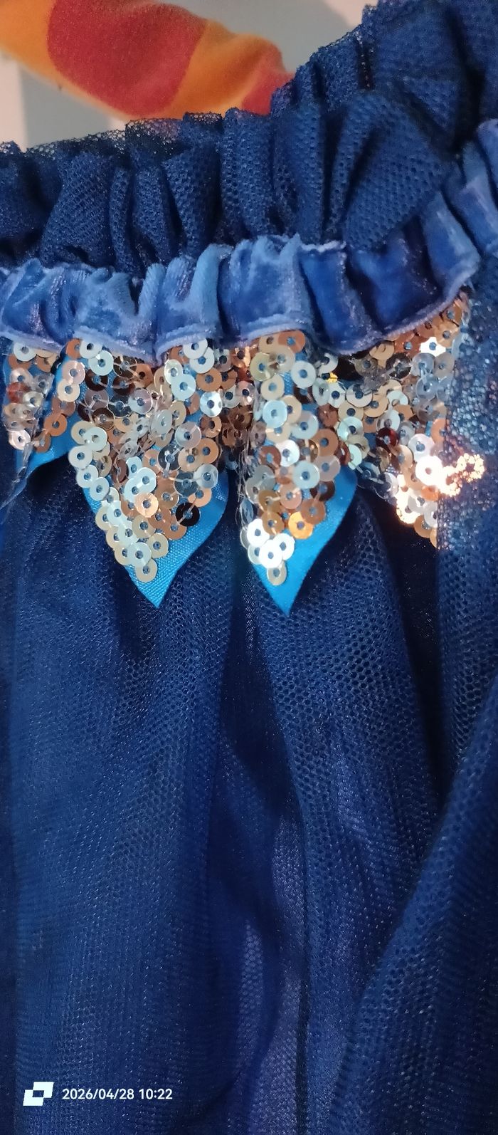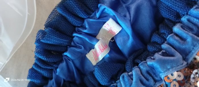 Bonjour Je vend cette jupe bleue foncée avec sequins dorés. A la ceinture velours, ça s est décousu. Taille élastique. Merci Billieblush 12 ans=150 cm donc 11ans
