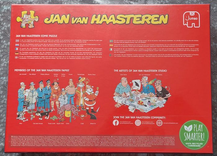 Un puzzle Jan van Haasteren de 1000 pièces avec des illustrations extrêmement détaillées, colorées et surtout amusantes. Chaque pièce de puzzle est unique et ajustée et se caractérise par un effet sans couture. Le puzzle fini ressemble à une affiche et peut être parfaitement accroché. Le carton et le papier utilisé sont recyclés dans le respect de l'environnement. Le puzzle est fabriqué aux Pays-Bas. Produit neuf non ouvert, traces possibles sur la boite. Ventes exclusivement au profit de l'association Les Félins de l'Eyre, pour le sauvetage de chats errants. (retrouvez-nous sur Facebook)