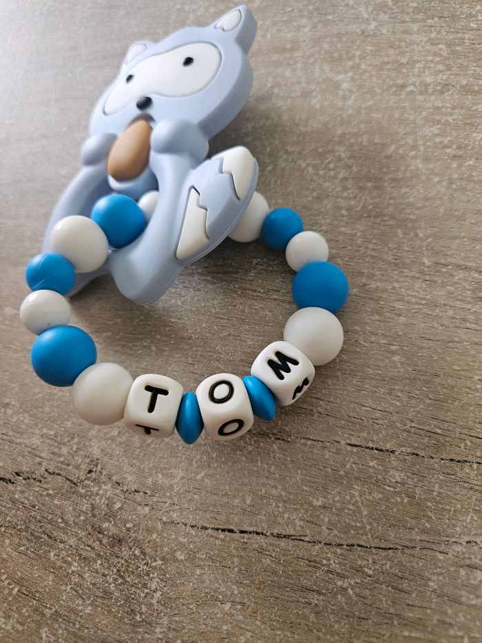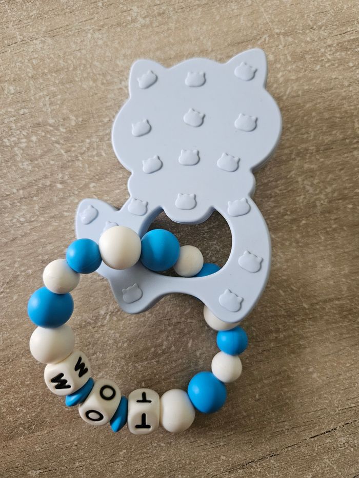 Jolie anneau de dentition personnalisé au prénom de "Tom" Très bon état Si jamais j'ai du 6 mois 😊 ✅️ Réduction sur les lots activé dès 2 articles ✅️ 📦 Envoi rapide 📦 ✅️Réponse rapide ✅️ N'hésitez pas à me contacter pour plus de renseignements 😊
