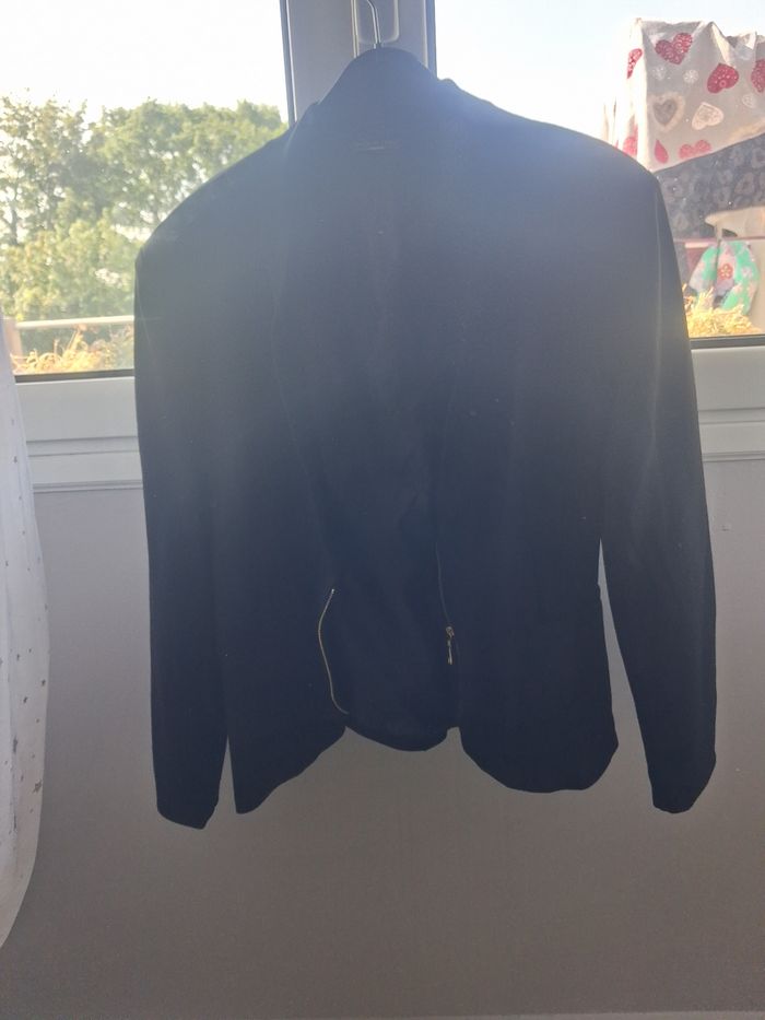 Veste blazer noire avec une petite fermeture éclair dans le bas.