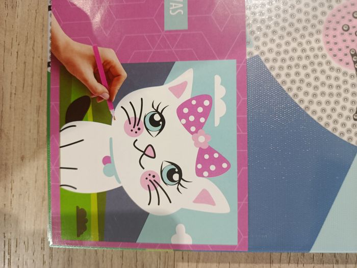 Toile Diamond painting - Chat, à partir de 6 ans Prix non négociable Dimension 27*27 cm Produit neuf sous emballage. Livrée avec les perles, ainsi que le support et le crayon. Toile déjà fixée au support bois. Cette toile permettra d'embellir la chambre de vos enfants, après la satisfaction de les avoir réalisé eux-mêmes.