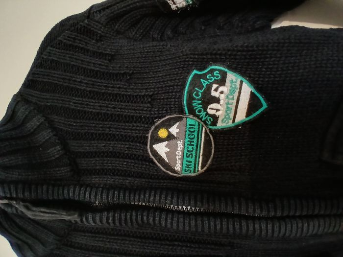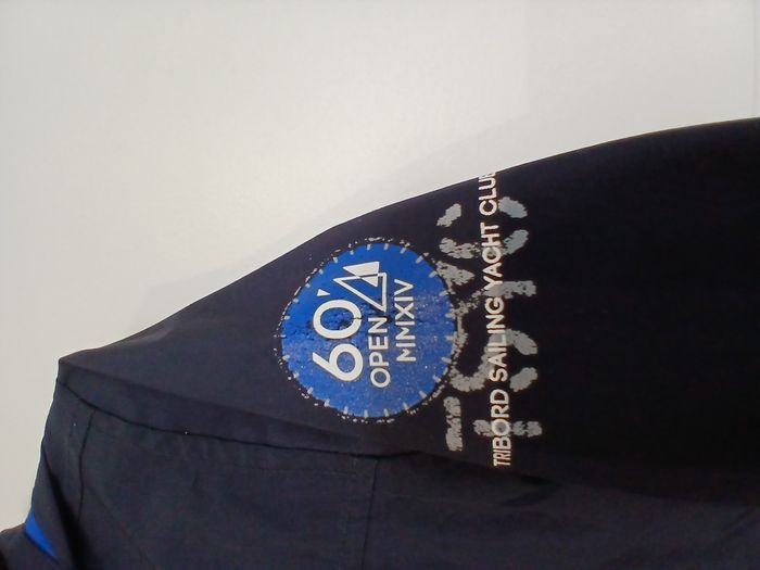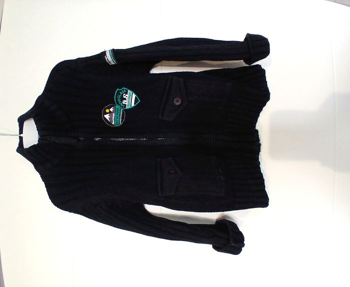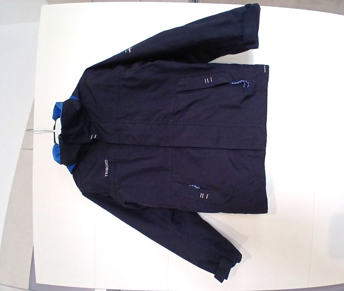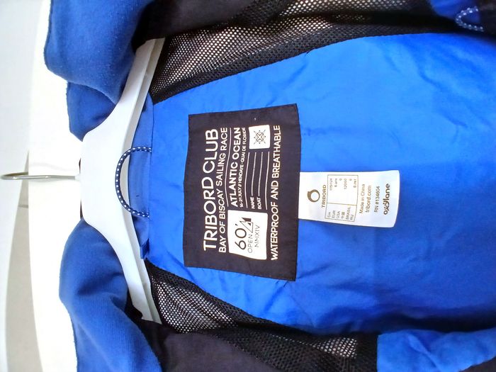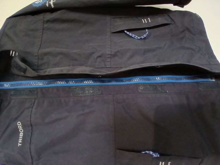 Très bon état - 1 gilet noir zippé Orchestra 6 ans. 2 poches sur le devant qui ferment par boutons. - 1 veste waterproof Tribord bleu marine avec capuche qui se rentre (voir photo). 2 poches zippées sur le devant. veste zippée qui se ferme en plus par scratchs (voir photo). Le logo sur l'épaule est un peu abimé (voir photo).