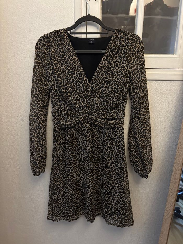 Manche en transparence et serrer au niveau des poignets. Taille S/36 Mi cuisse Couleur léopard.
