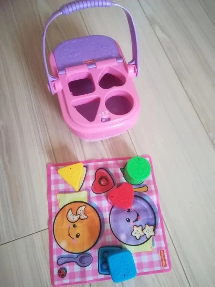 Panier pique nique musical. Enfoncer les formes pour déclencher la musique. Avec 4 formes + petit tapis. Très bon état